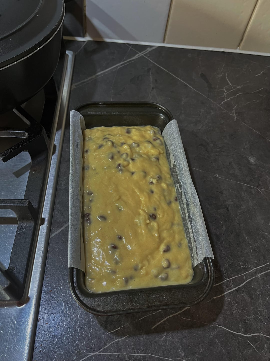 * Once your brown butter has cooled down slightly, add 150g granulated sugar, two eggs, half a cup of Greek-style yoghurt, half a cup of milk & 2 tsp of vanilla paste/extract. Whisk until fully incorporated. * In another bowl, whisk together 225g plain flour, 1 & a half tsp of baking powder and half a tsp of salt. * Add dry ingredients to the wet and fold in until just combined, do not over mix! Gently fold in 200g of chocolate chips. * Pour in batter into the prepared loaf tin and evenly spread it. Sprinkle crumb mixture topping all over and bake for around an hour. If not fully done after an hour (if a toothpick doesn’t come out clean when you insert it), bake for another 10-15 minutes (covering the top with baking paper if needed to stop the crumb topping from burning). * Once finished baking, leave to cool on a cooling rack then sprinkle some powdered icing sugar over the top.