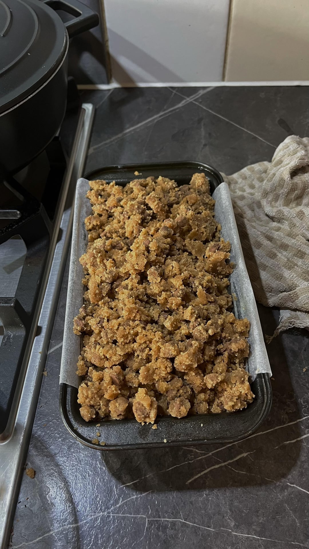 * In another bowl, combine 90g plain flour, 1tsp of cinnamon, 50g granulated sugar, 55g tightly packed brown sugar & 85g melted unsalted butter. (Not the browned butter!) * Mix in 100g of chocolate chips (I used half milk, half dark) until it’s crumbly then place in the fridge to chill.