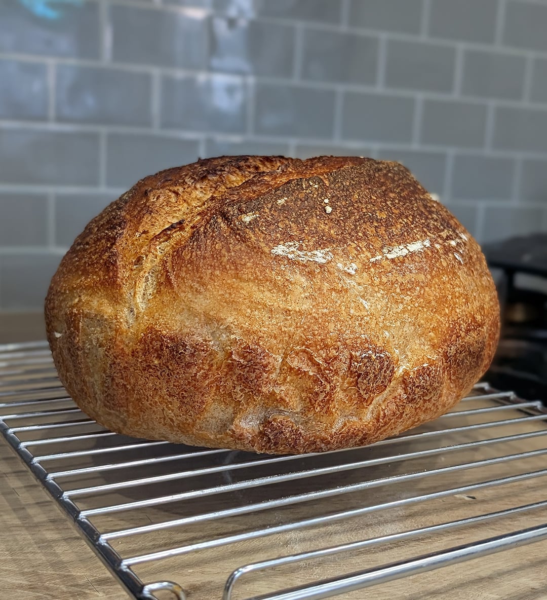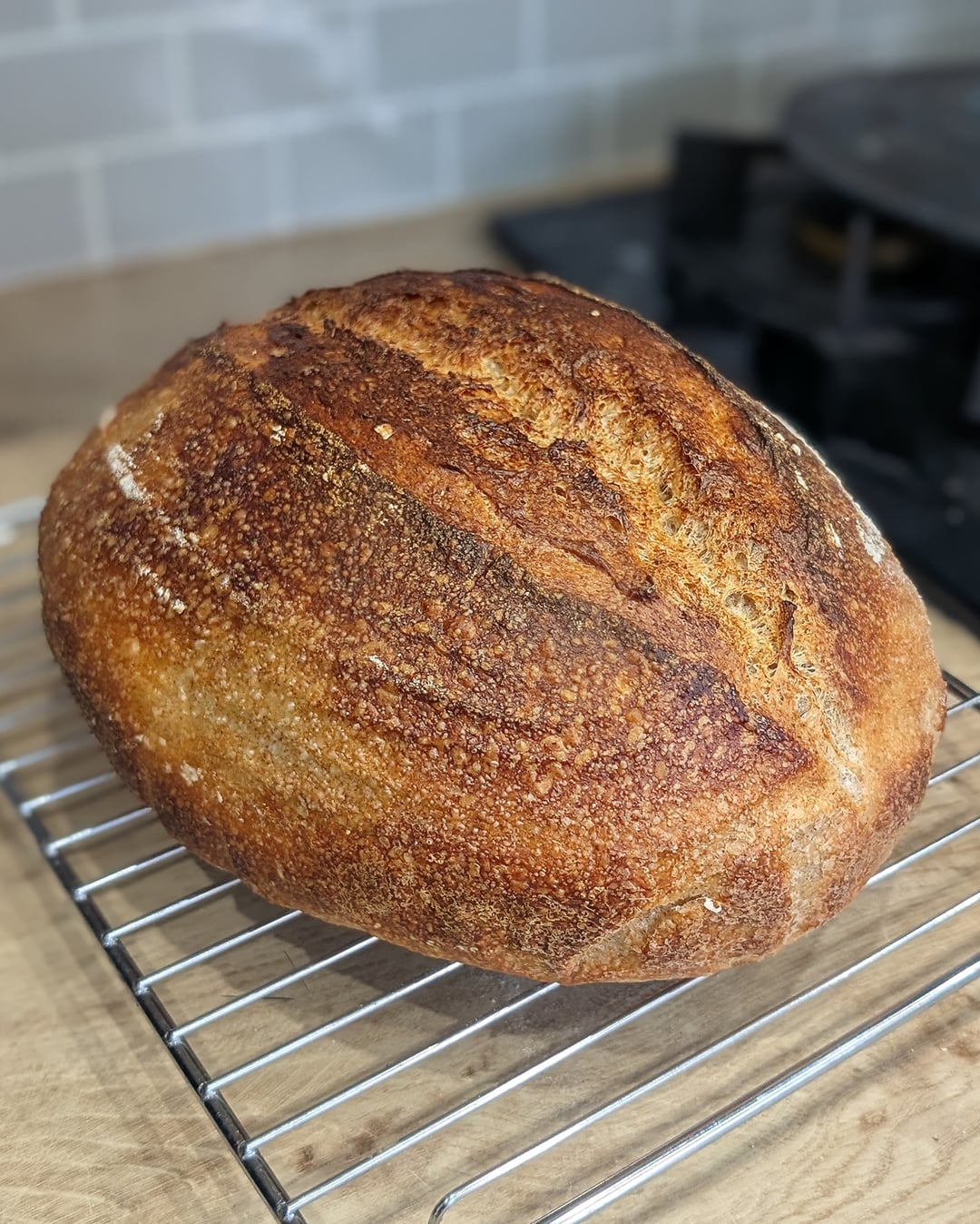 This was 200g of unfed starter, 400g 14% protein white Manitoba, 100g 13% protein wholewheat, 50g rye, 12g salt, 385g water.