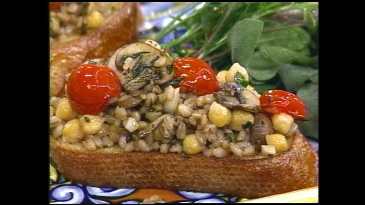 so here in my pot i’ve already cooked down some herbs i have some sage flat leaf parsley rosemary and fresh garlic i minced it all up made of batuto and put it in with a little bit of olive oil that becomes a sofrito at that point and added some fresh mushrooms and the mushrooms are now cooking down where they are just exuding their liquid so now we want to add some tomatoes and for this you can use cherry tomatoes or plum tomatoes use fairly ripe tomatoes because you want this to cook down really quickly and to cut tomatoes it’s always nice to use a tomato knife something that doesn’t that can cut soft foods tomatoes cheese and we want to put in oh about a half a cup or so of tomatoes so now i can add those they go in and this is a very quick salad once you have all of the beans soaked so now we’re going to give that a little bit of salt and pepper and now last night before you came over today i took chickpeas and put them in some water because these we have to soften up otherwise if we tried to cook those like that we’d be here forever so in a pot of water soak the beans overnight cover them and then the next day you want to cook them just until the skins slide off and then you want to drain the chickpeas and then we’re going to set these aside now so drain them off let them cool just for a minute or so and come back and see where we are here now i save a little bit of that chickpea water to add right here in my pan so there’s about a quarter of a cup of the reserved water i’m gonna turn the heat up on this now and now i want to give this a little bit of oregano dried oregano and a little bit of hot red pepper goes in you don’t want to put that little zippy hotness in then you can just leave it out so hot red pepper and then we want to add our photo here is our faro already cooked you remember how daniela made that quick faro dish for us so the faro goes in and then the drained chickpeas go in this is so quick once you have everything together and you mix this well let it cook for a few minutes and then this is served as a warm salad over bread