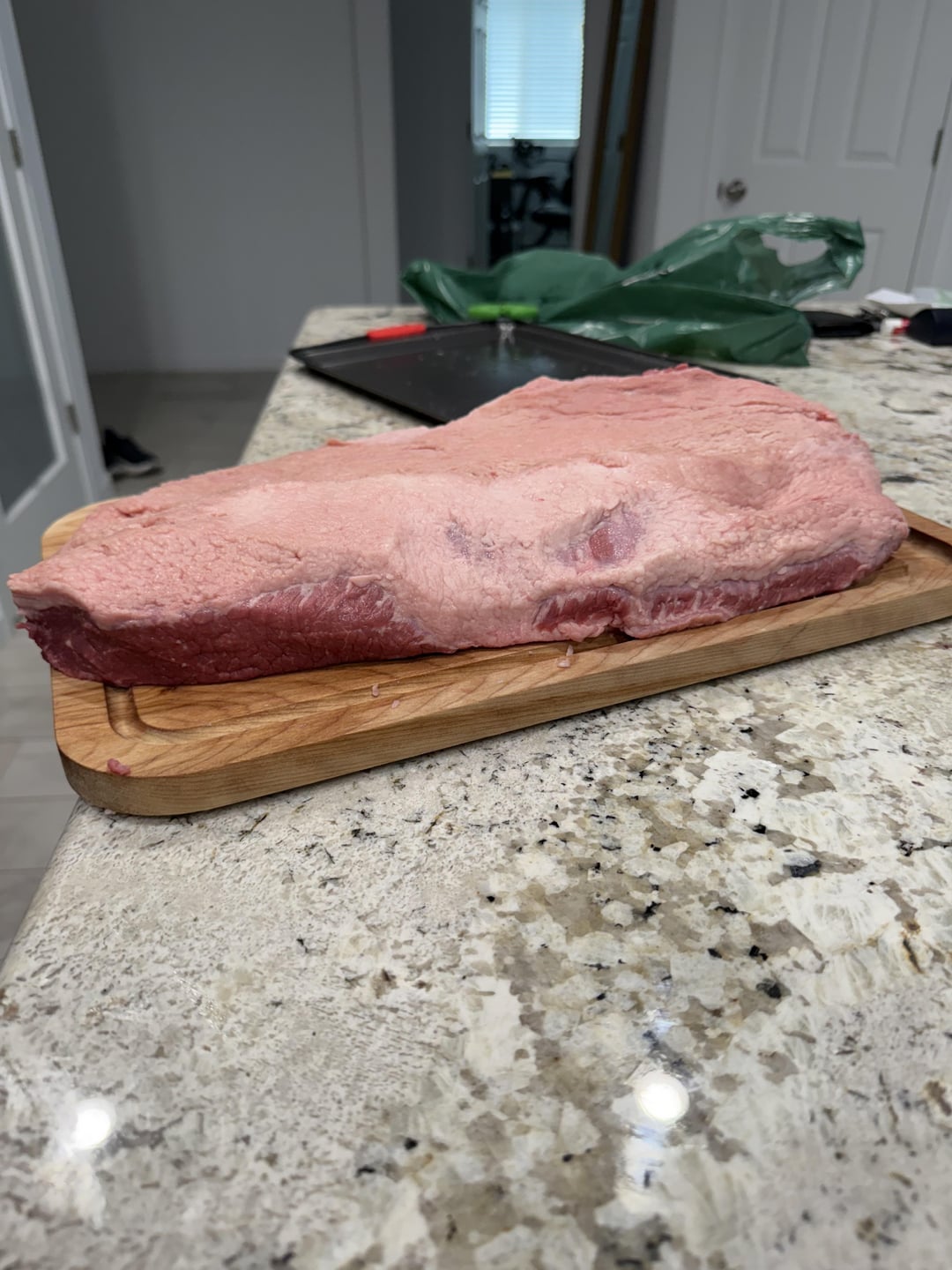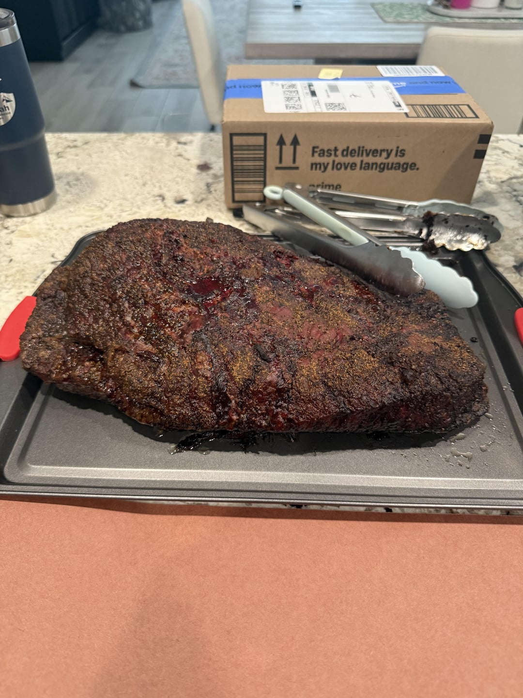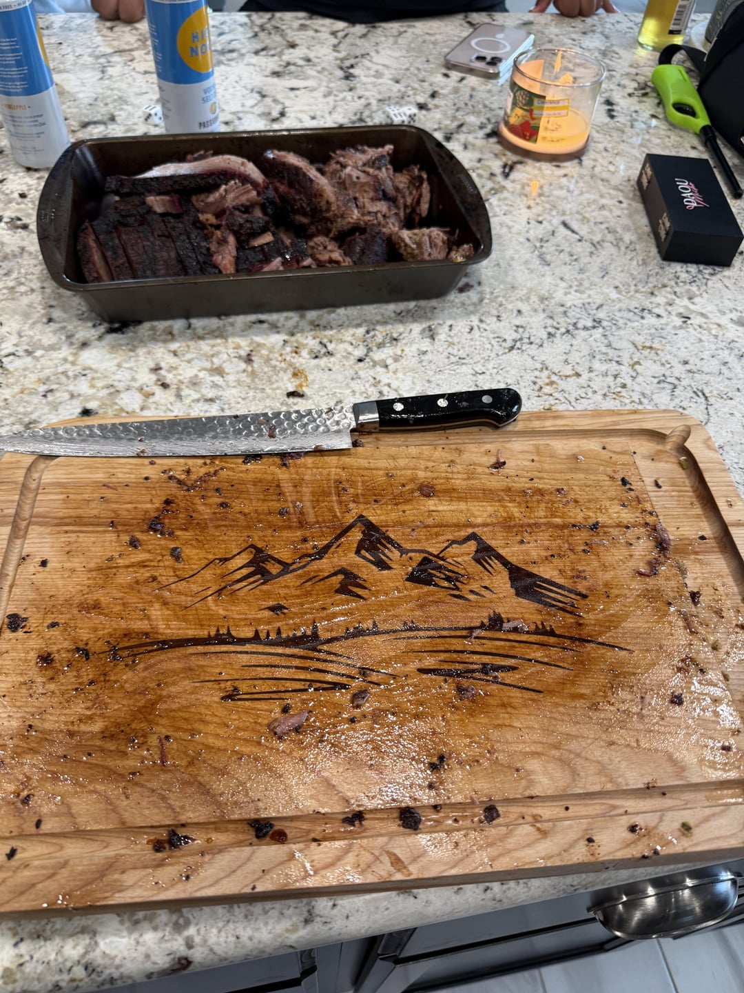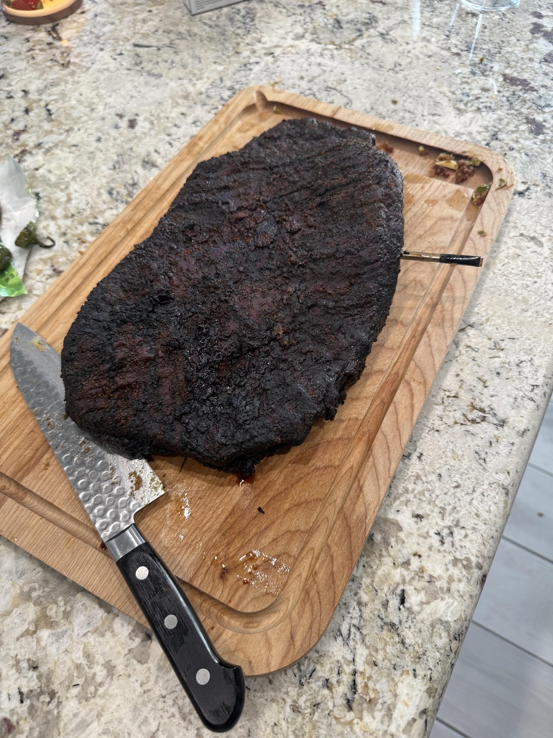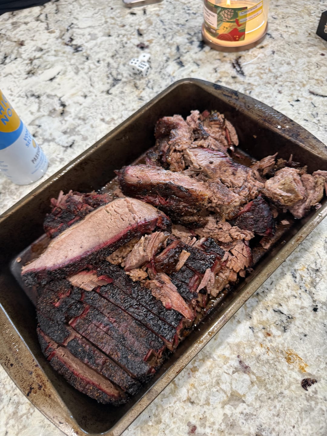 Used 50:50 salt pepper with mustard as binder. Smoked at 225 for 15 hrs internal temp was 170 when I removed it and wrapped it. Went back in the smoker at 250. Pulled it out about 7 hours later at 200 internal temp let it rest for a little over 30 minutes. Guest were impatient hungry and drunk so they wanted to eat. Served with jalapeños, cheddar cheese corn bread and salad.