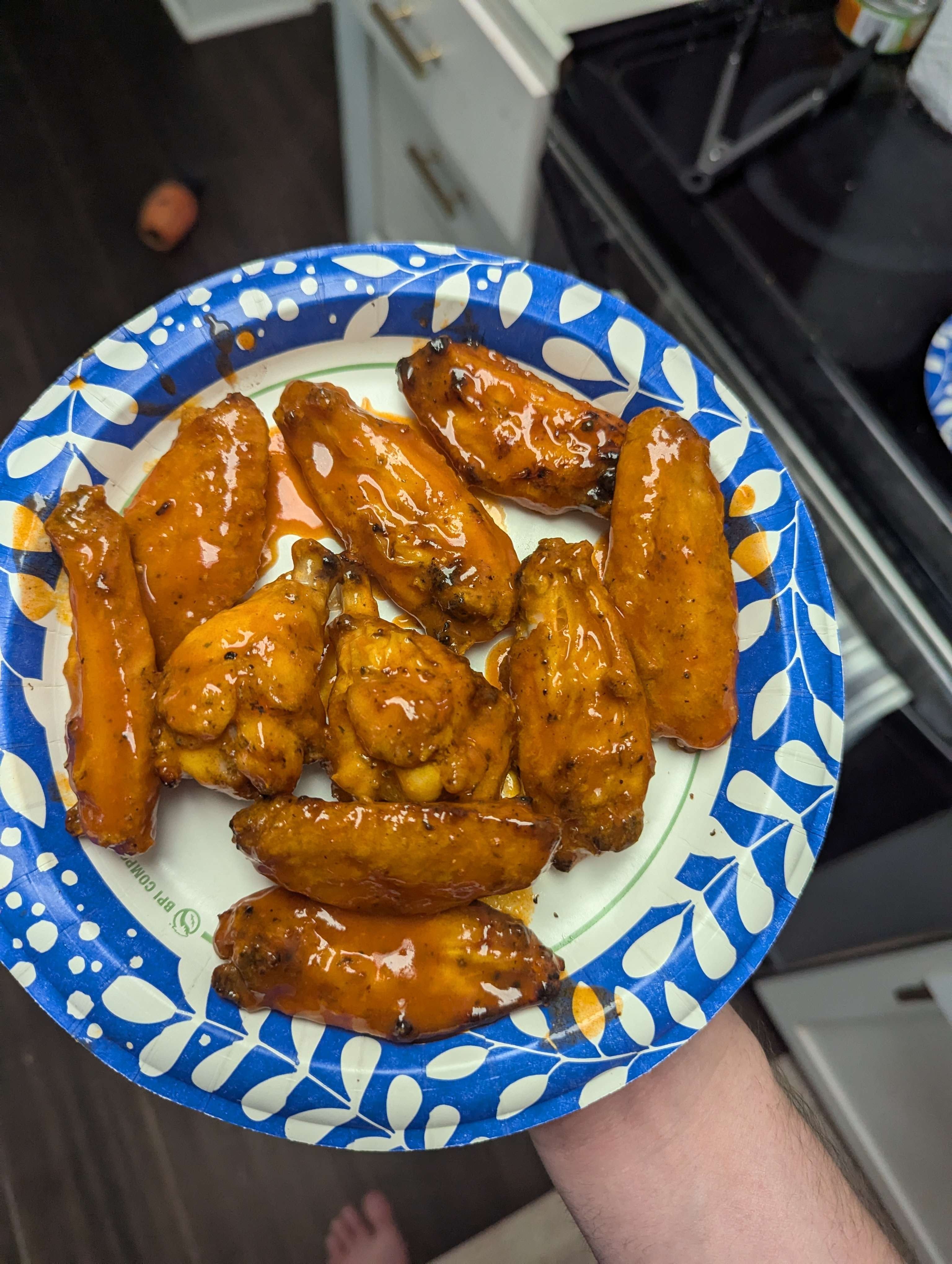 Grill was on 350, turned them every 5 minutes for 30 minutes. Sauce was Franks/Skyline/2 drops of Da Bomb/Pepper/Butter.
