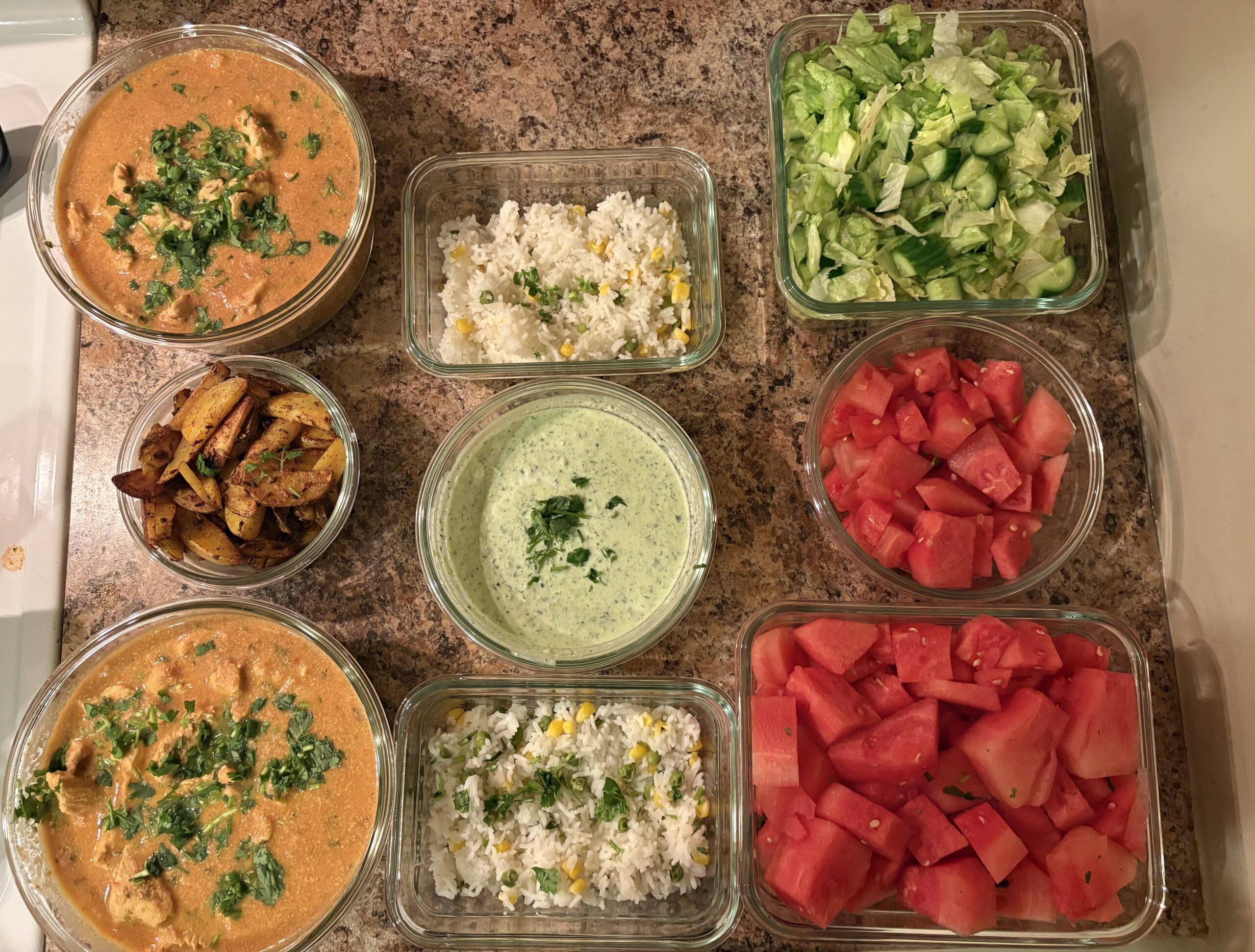 Butter chicken: cut 5 whole chicken breasts into small bite-sized pieces. Marinated using full fat yogurt, ginger garlic paste, salt, coriander powder, turmeric powder, red chili powder, garam masala, lemon juice, and salt. Mix well for about 5 minutes. Let it sit for 2 hours, better if overnight. In a pan, throw some ginger garlic paste, 2 whole red onions, and 6 tomatoes. Cook everything until the raw smell goes away. Let it cool down. Once cooled down, put that mixture into a blender with salt and a handful of cashews. Blend well. In a pot, heat up oil and fry the chicken. Once almost done, throw the mixture in with about 50gms of butter and cook for 2-3 minutes. Throw in finely chopped coriander and it’s ready!