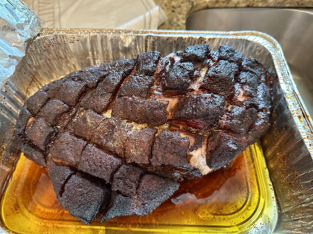 Cook: 12 hrs on SuperSmoke at 200 on the e top grill. A couple hours at 250 to get it to 165 internal. Then 3 hours at 275, in a pan, covered with a mix of Apple Juice, Apple Cider Vinegar, butter and brown sugar. Got it up to about 202 internal, then took it off and put it in an oven to rest.