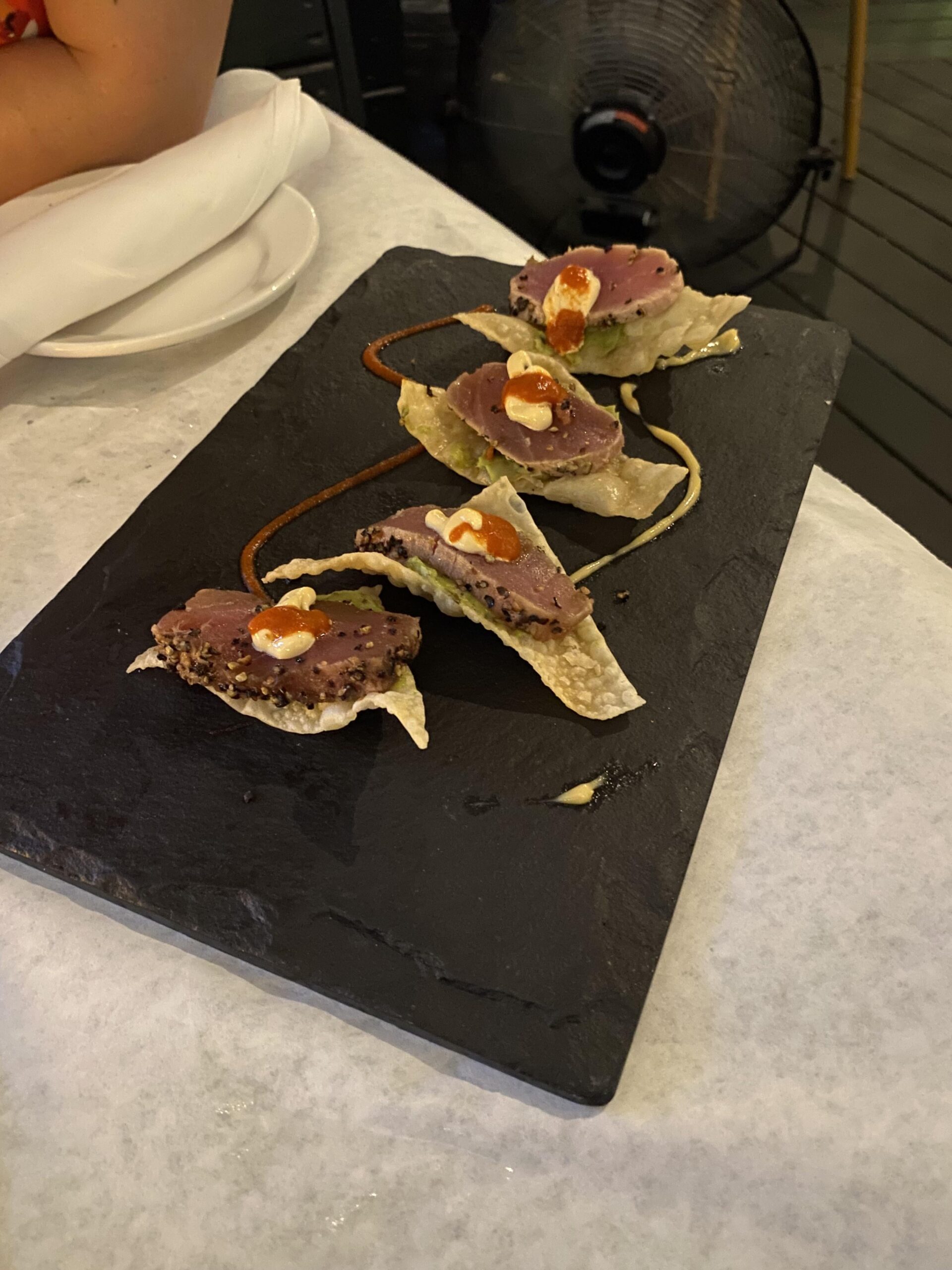 Its seared tuna and it’s on a normal slate serving piece for small bites.