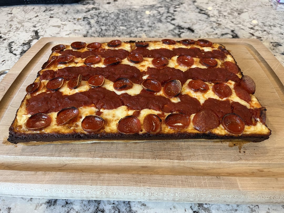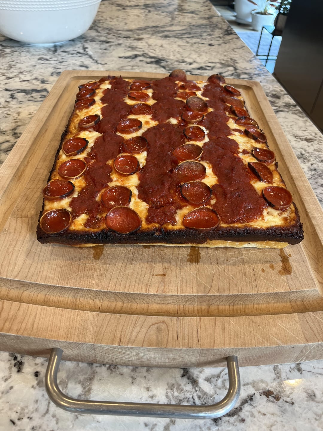 My first attempt at Detroit style. Couldn’t find brick cheese in the PNW so improvised with Muenster on the edge with a mix of mozzarella and Monterey Jack.