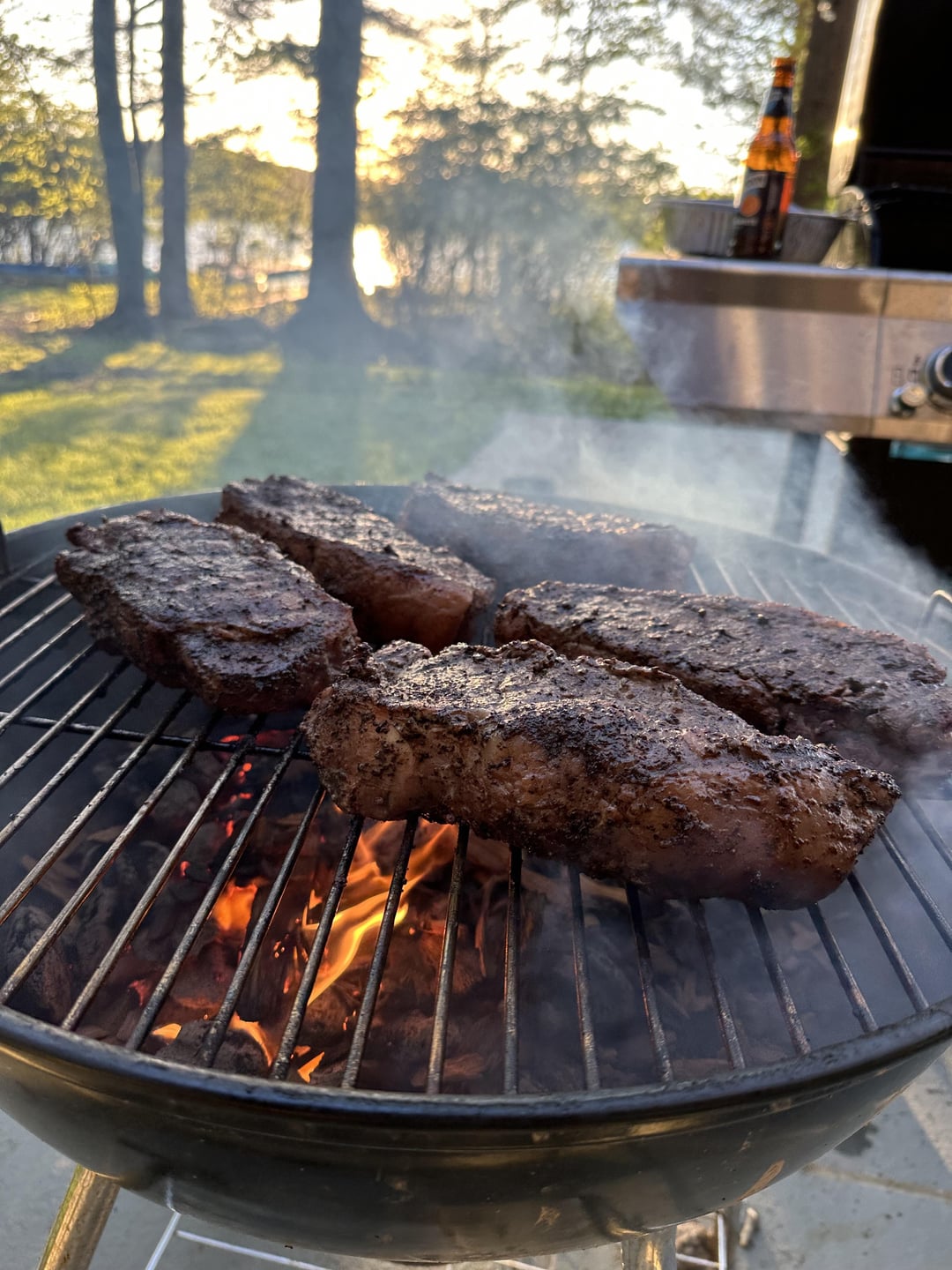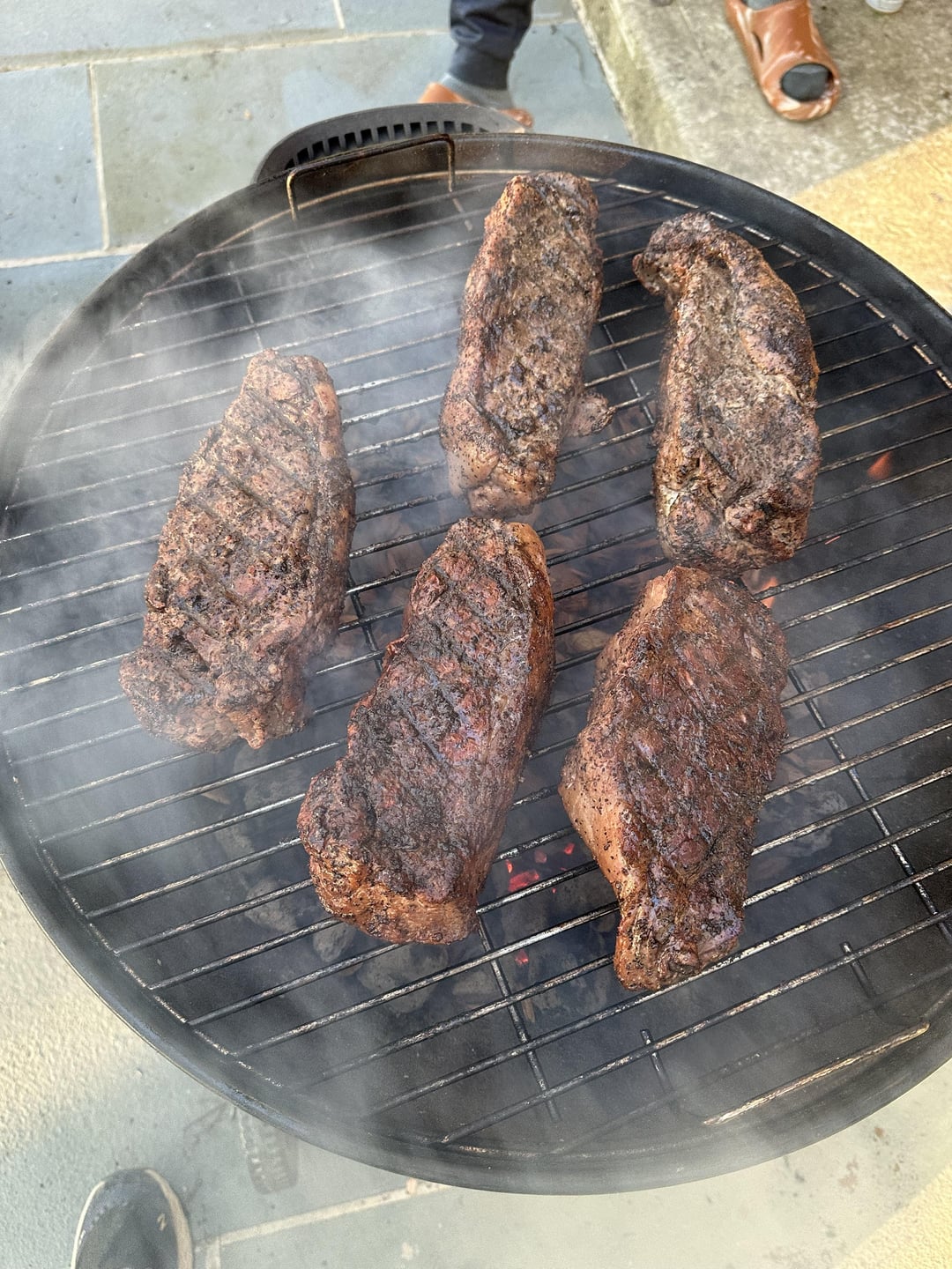 130 x 2h (in a home depot bucket), ice bath, patted completely dry, dusted with espresso + hot chocolate powder, seared on a hot charcoal grill w mesquite wood chips.