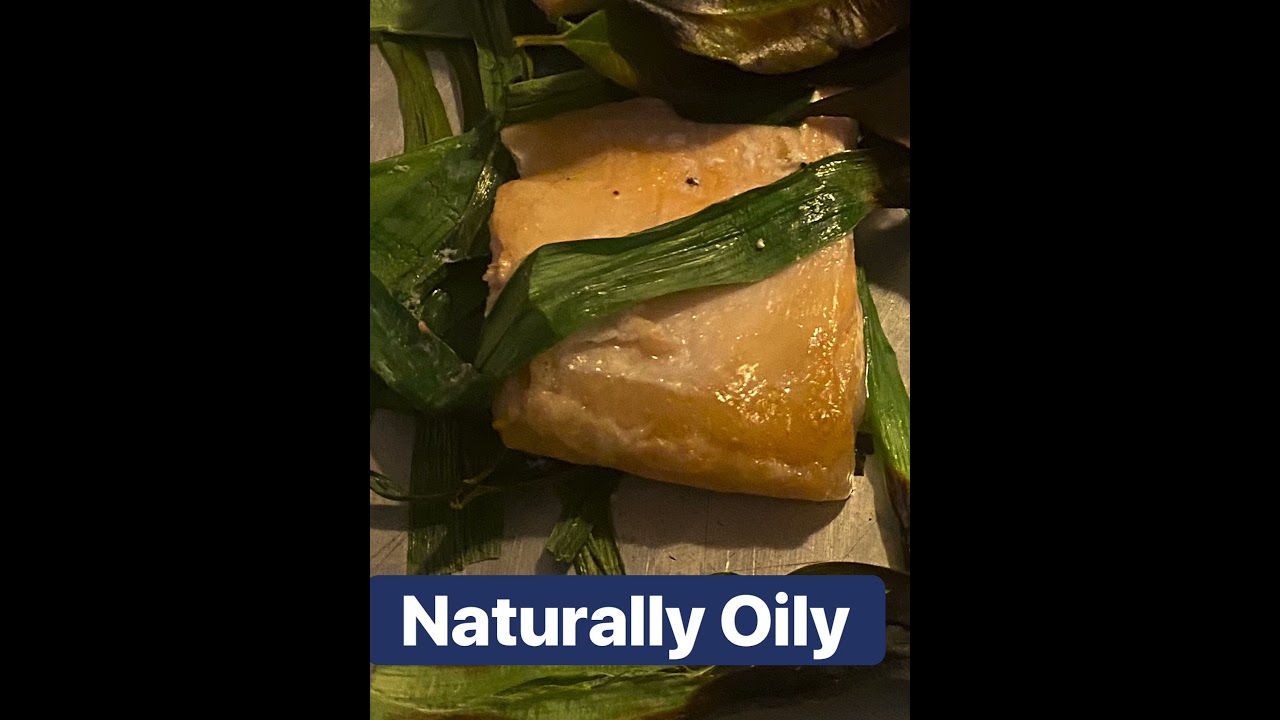 no salt salmon fillet peace be with you this salmon was grilled with fresh leaves there’s leak leaves and lemon Myrtle it goes oily because that’s just how they interact I didn’t add any oil or butter to this they just the oil comes out of the fish and the leaf this is a lemon Myrtle Leaf it was fresh from the tree when I put it down and then it goes a bit brown or a bit black as it loses its oil and its moisture what can I say praise be to God that’s what I say praise be to God the salmon is delicious no salt no oil no sugar it just the the natural compounds in the leaf with the heat they work