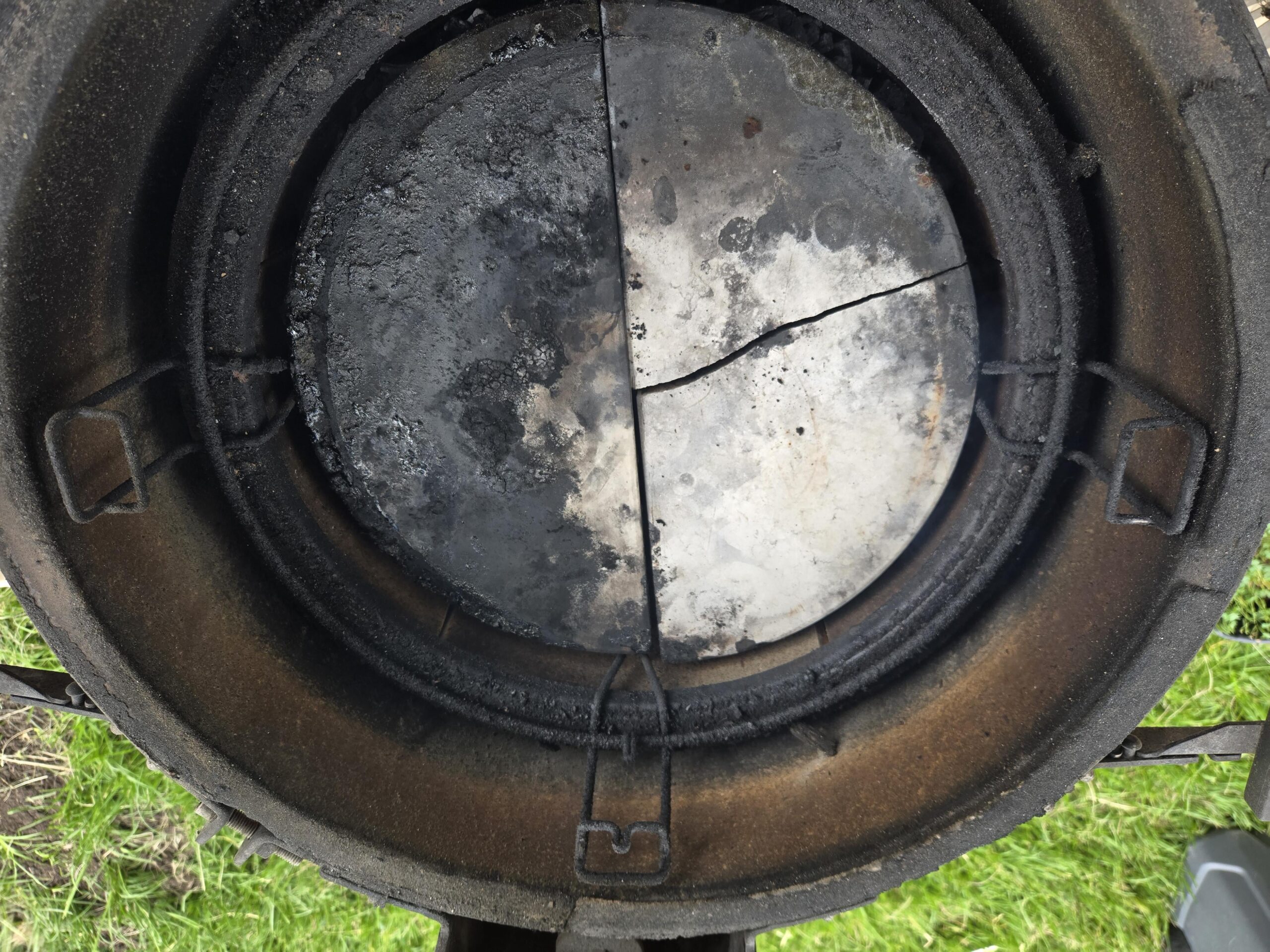 I had my KJ for 6 years and my heat deflectors broke 4 times with 1 time completely cracking like his and the other 3 times were all stress cracks located throughout the heat deflectors, I also had my fire box crack once. I am not sure if he has his heat deflectors too low becasue I seen YouTube Videos of KJ chefs cooking with them in both positions but I would say that moisture is what is causing these deflectors to crack.