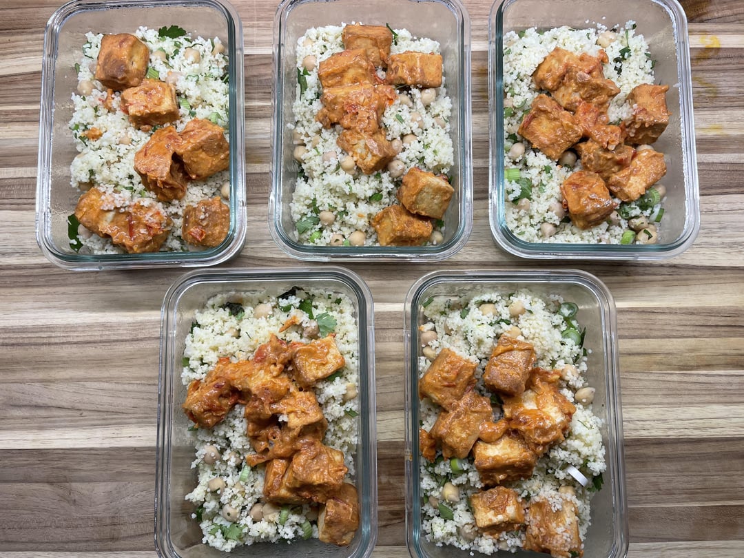 harissa tofu and herbed couscous (https://www.lazycatkitchen.com/harissa-tofu-herby-couscous/#recipe-start)