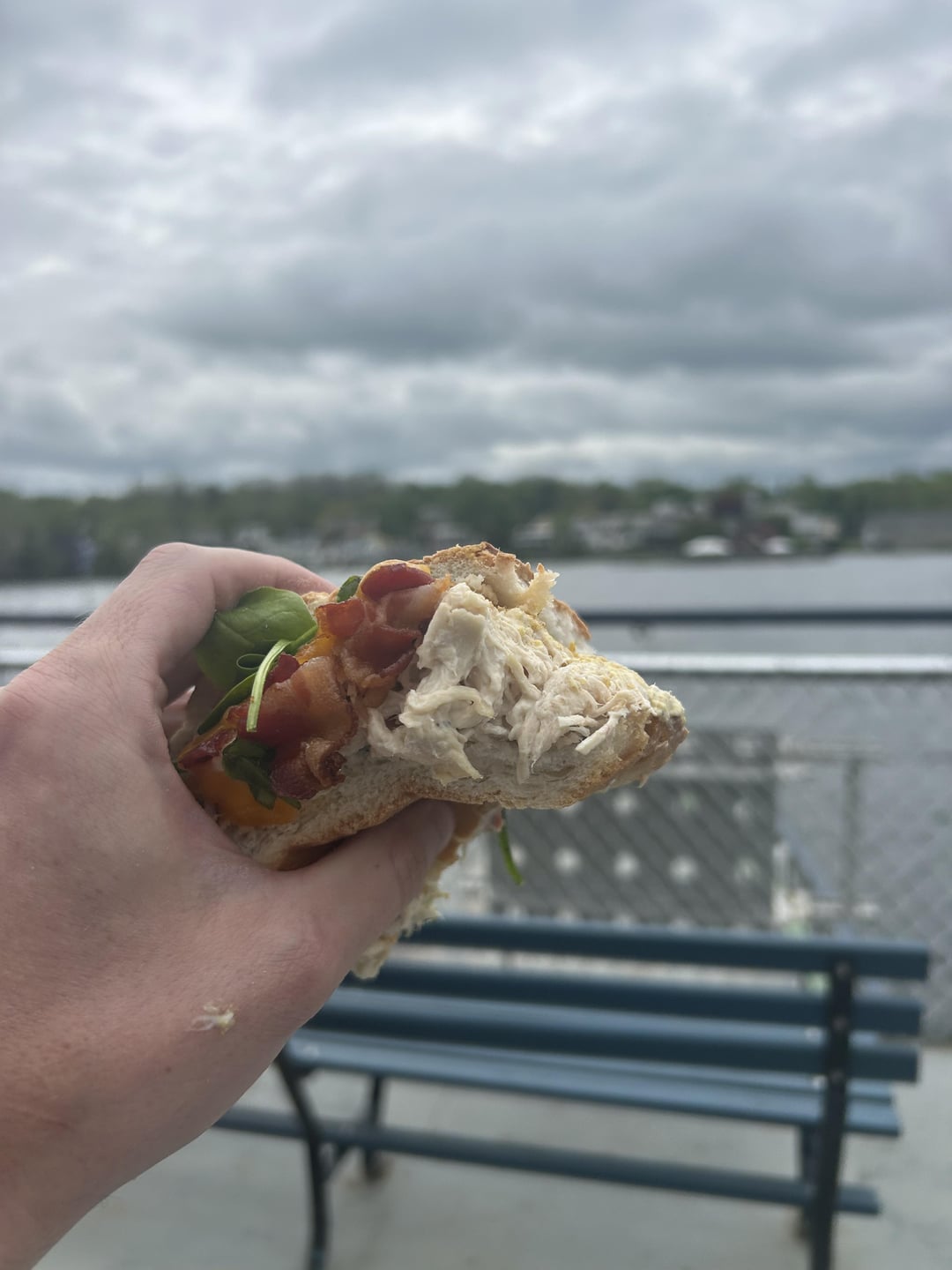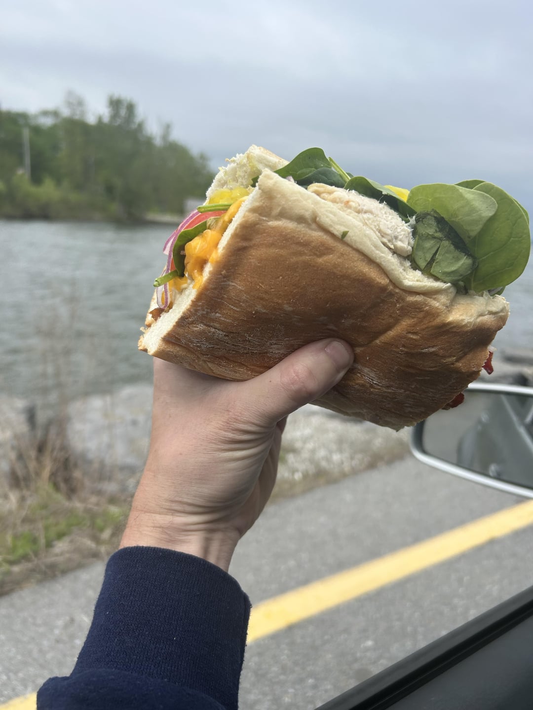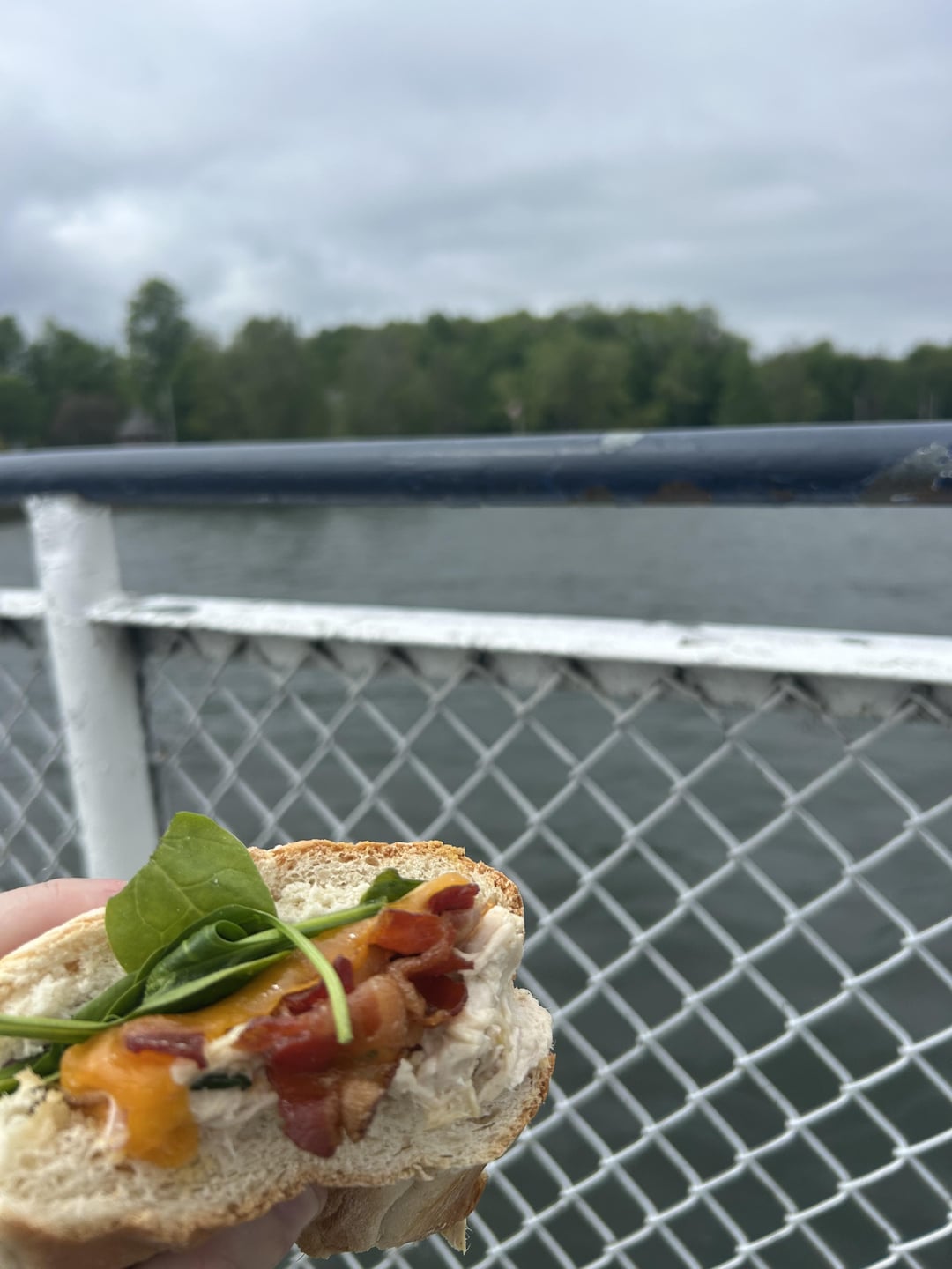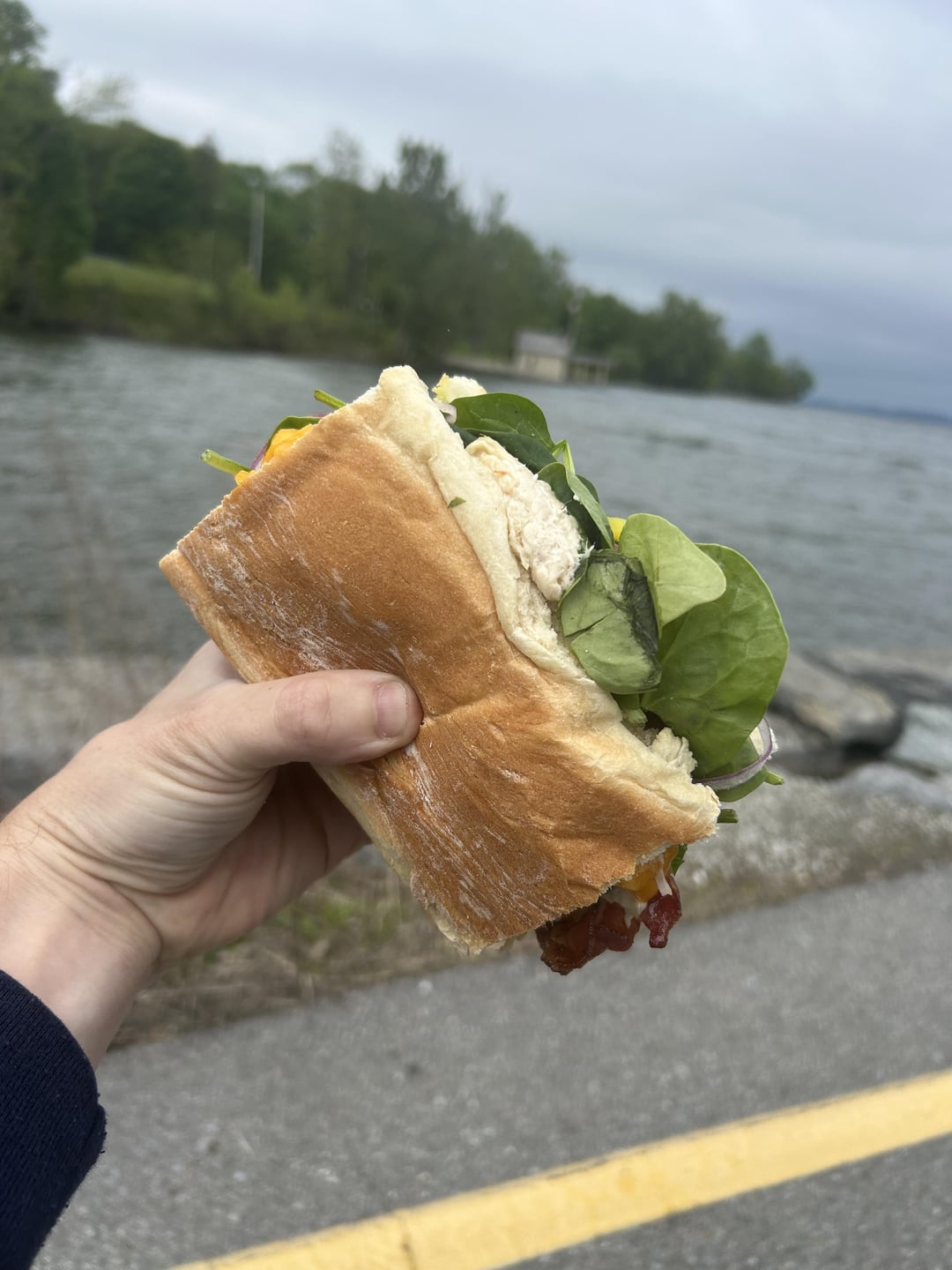Sandwich from River and Rails Market and Deli in Essex, NY. Ferry from Essex to Charlotte, VT. Hard to get good pictures since there were a lot of things on the sandwich besides chicken salad, it had bacon, cheddar, spinach, tomatoes, red onions, and banana peppers on homemade white bread.