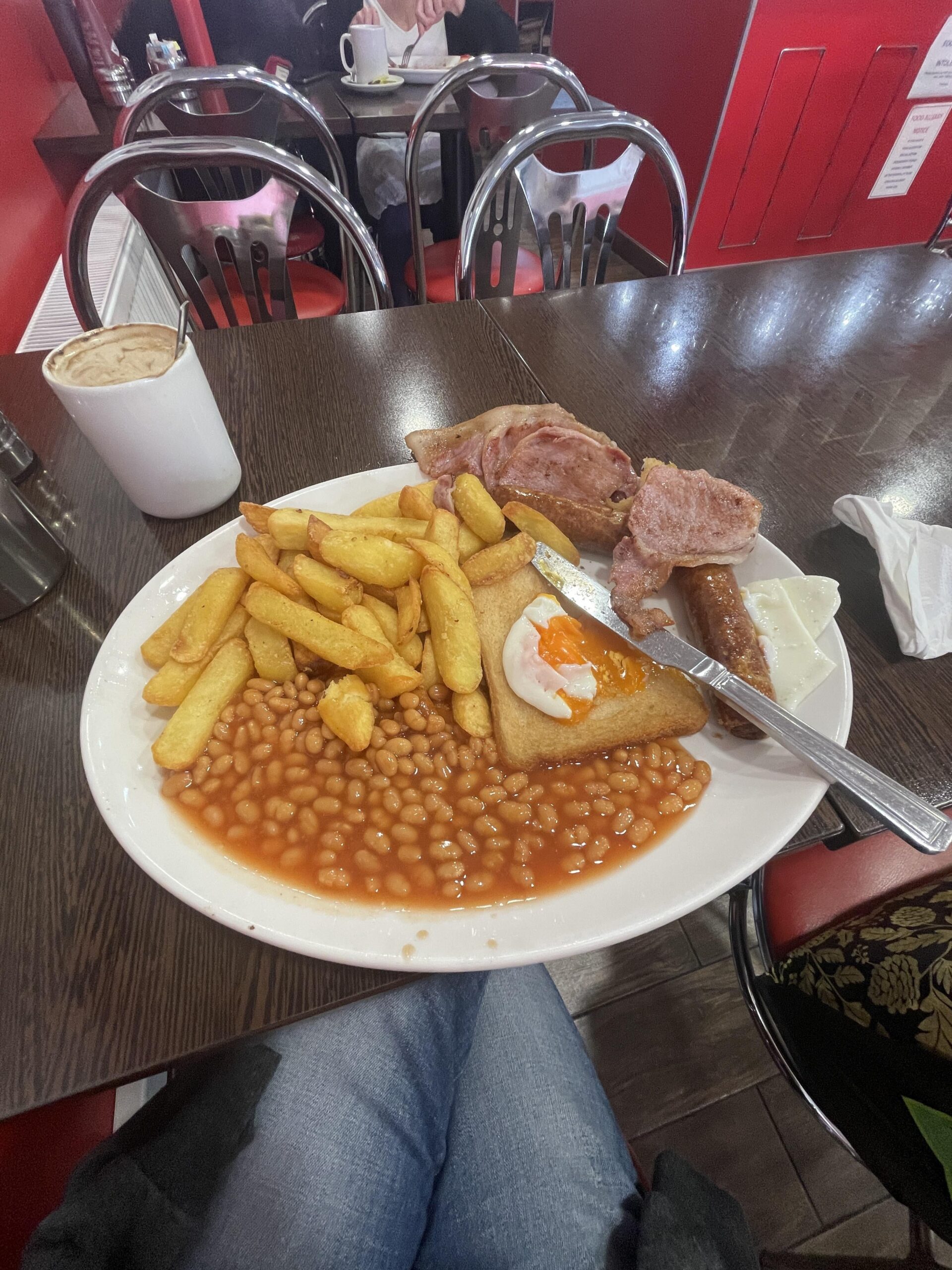 Chips, beans, 3 bacon, 2 sausages, fried egg on fried bread and a coffee at the Giggling Sausage In Bexleyheath, south east London. Plate was HUGE – Alan Partridge would be proud. Aha!!!