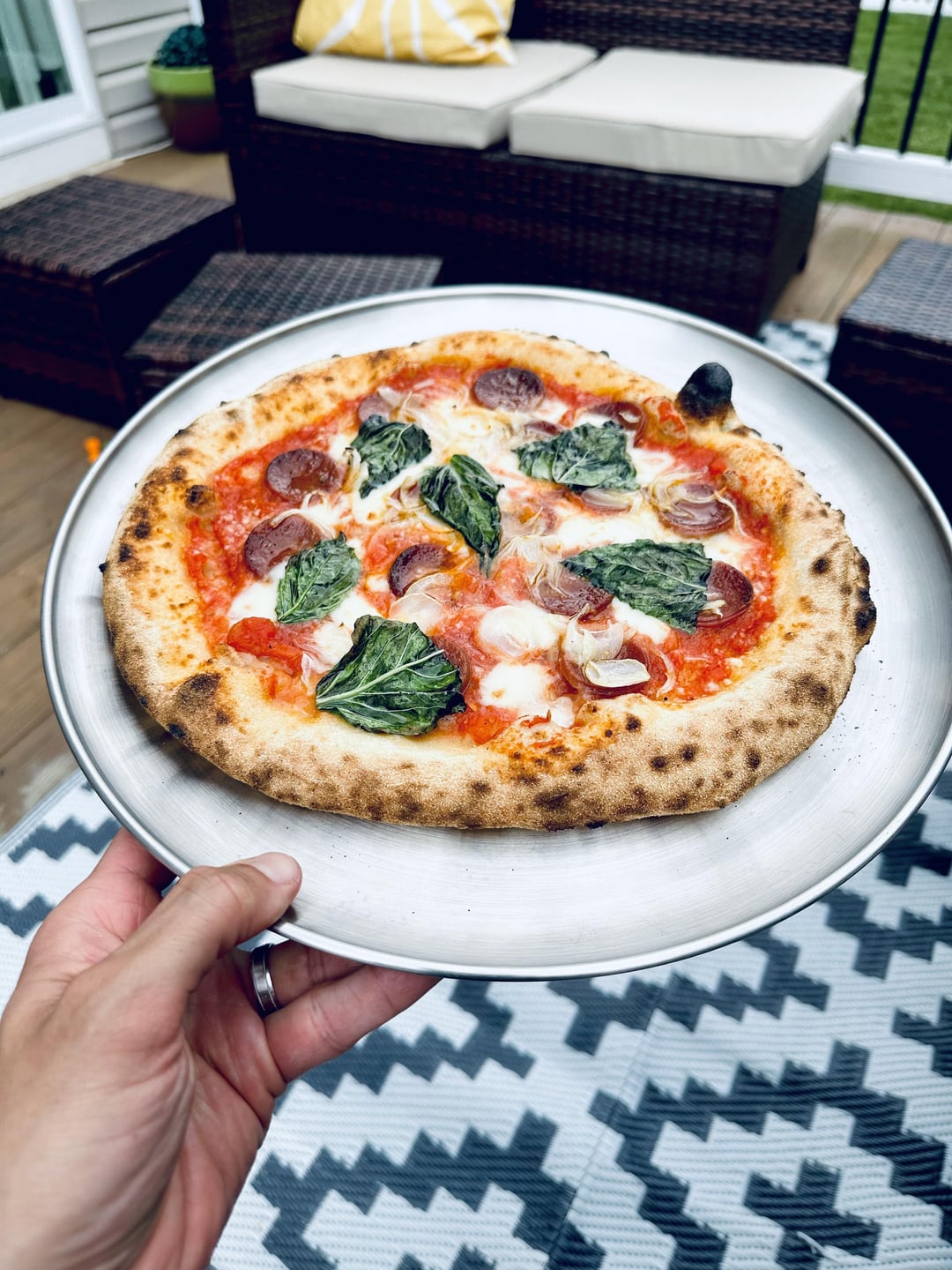 Topped it with hand-crushed San Marzano tomatoes, a sprinkle of sea salt, pepperoni, sliced onions, fresh mozzarella, and finished with a drizzle of Tuscan EVOO and pecorino romano cheese. Final result was totally worth the effort!