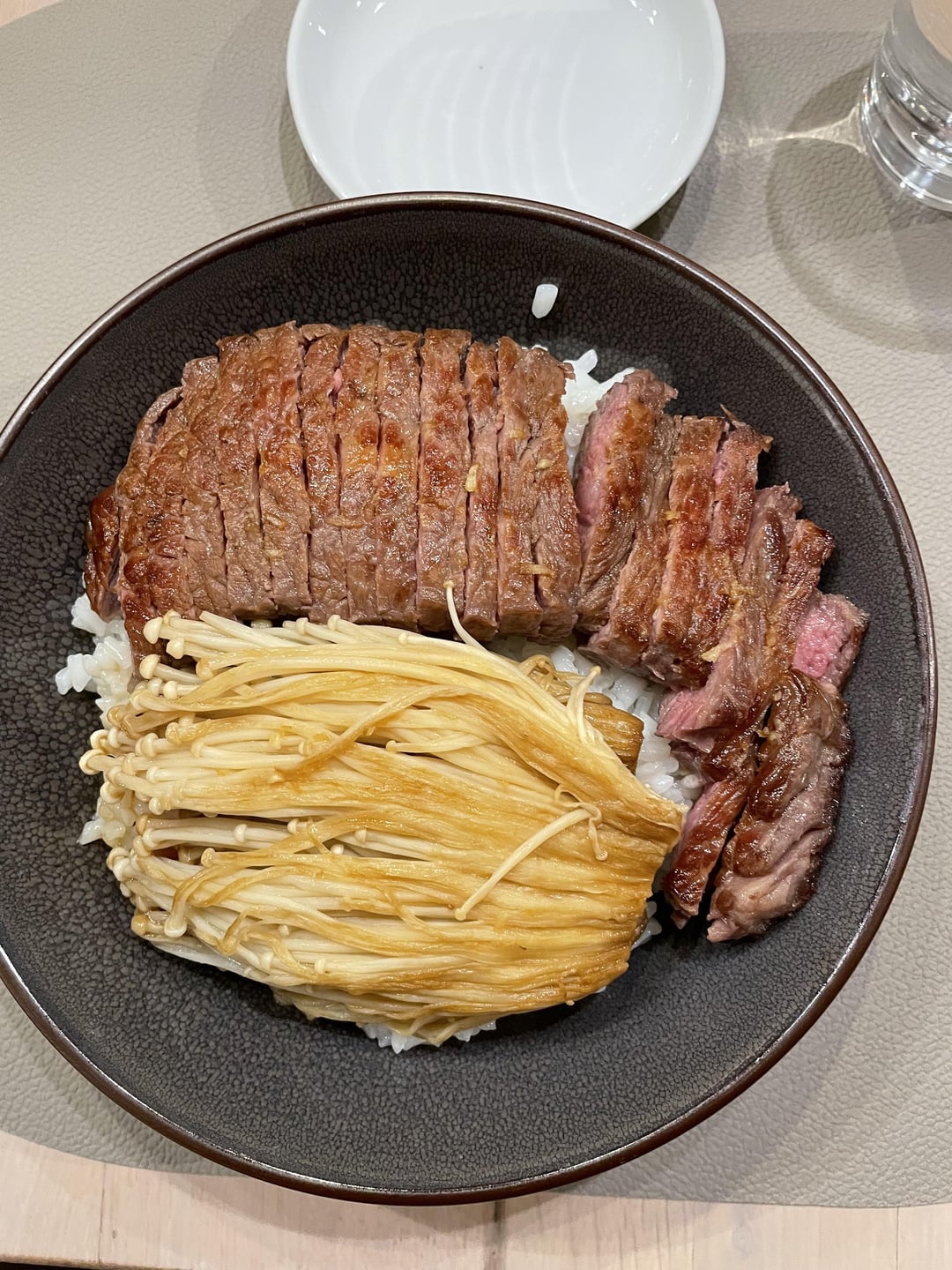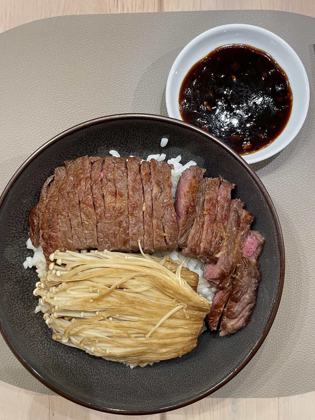 Striploin, 53 degree Celsius, 4h, rice, Enoki.
