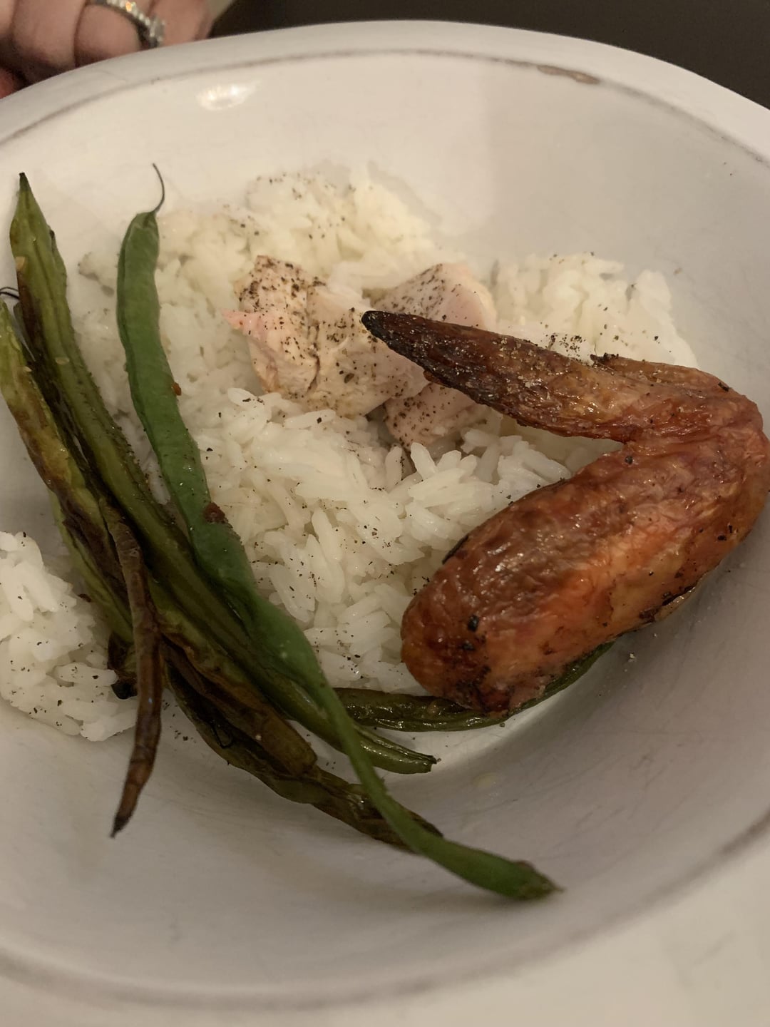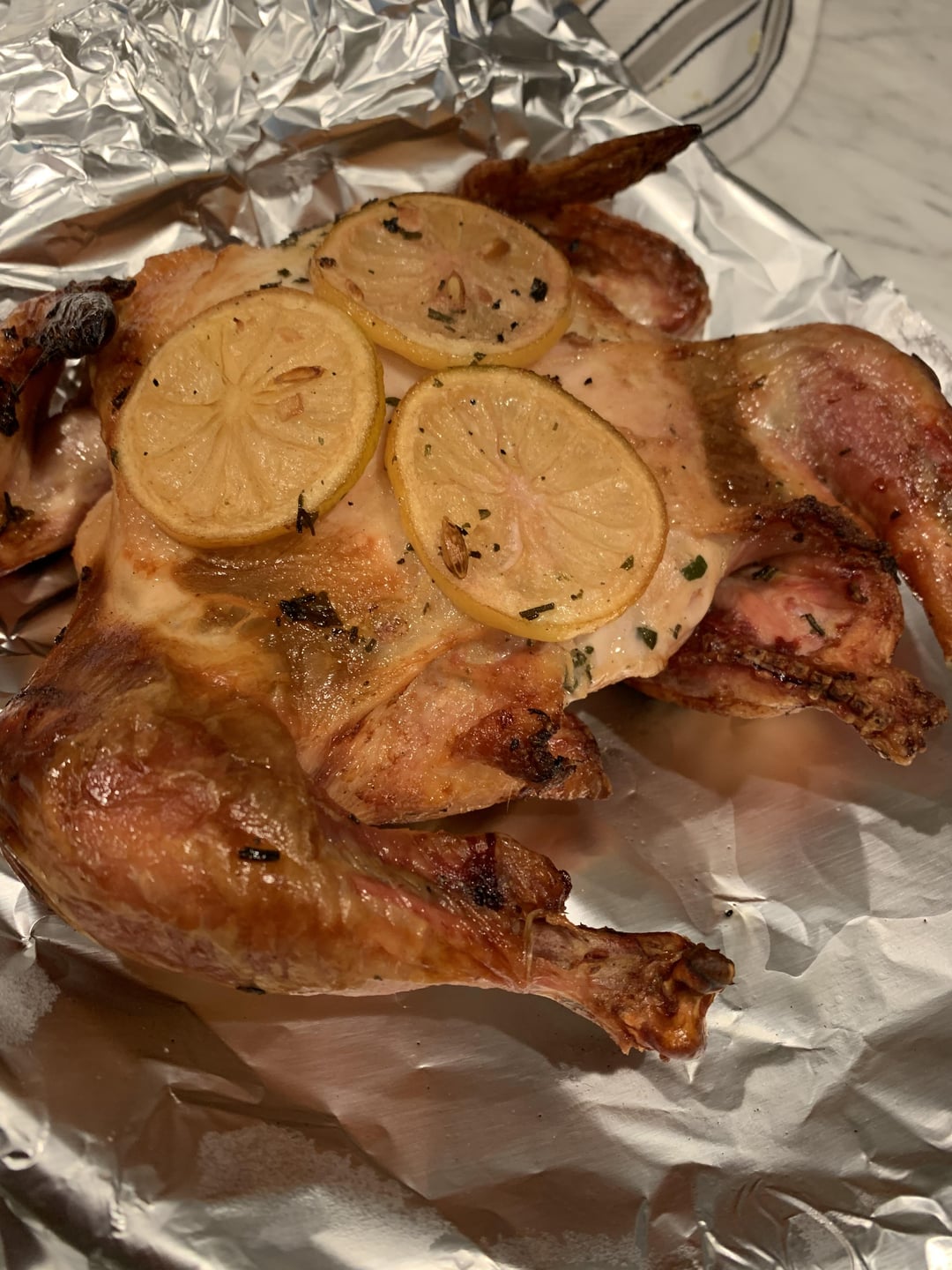 Pulled off when breast temp was 160, which was about 1.5 hours. Served with roasted green beans and white rice. Skin was crispy and meat was very tender and juicy.