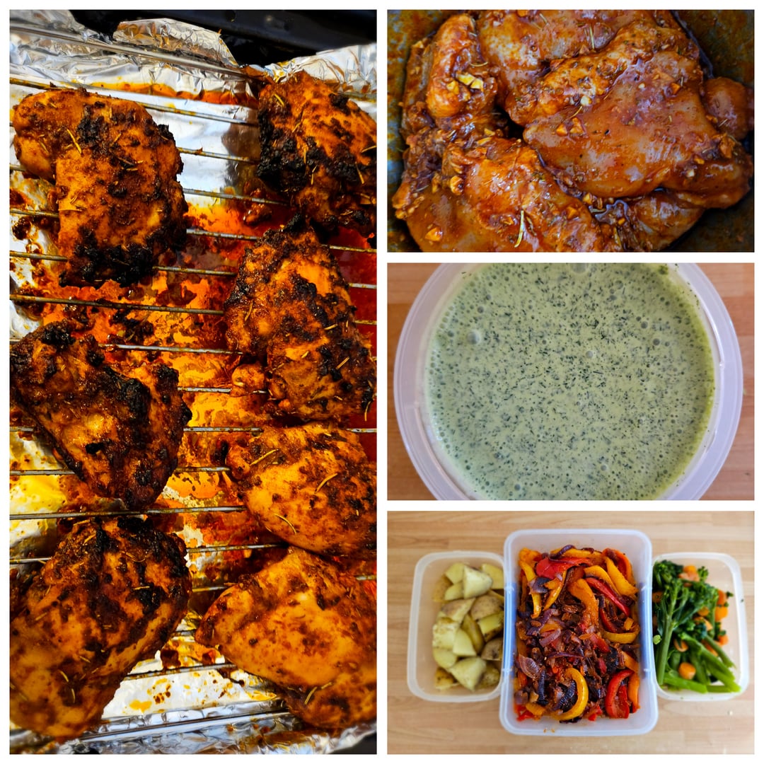 Paprika lemon chicken thighs – dumped in the marinade this morning and grilled up this evening. Will serve with the peppers and onions and a side salad for lunch, rice for dinner.