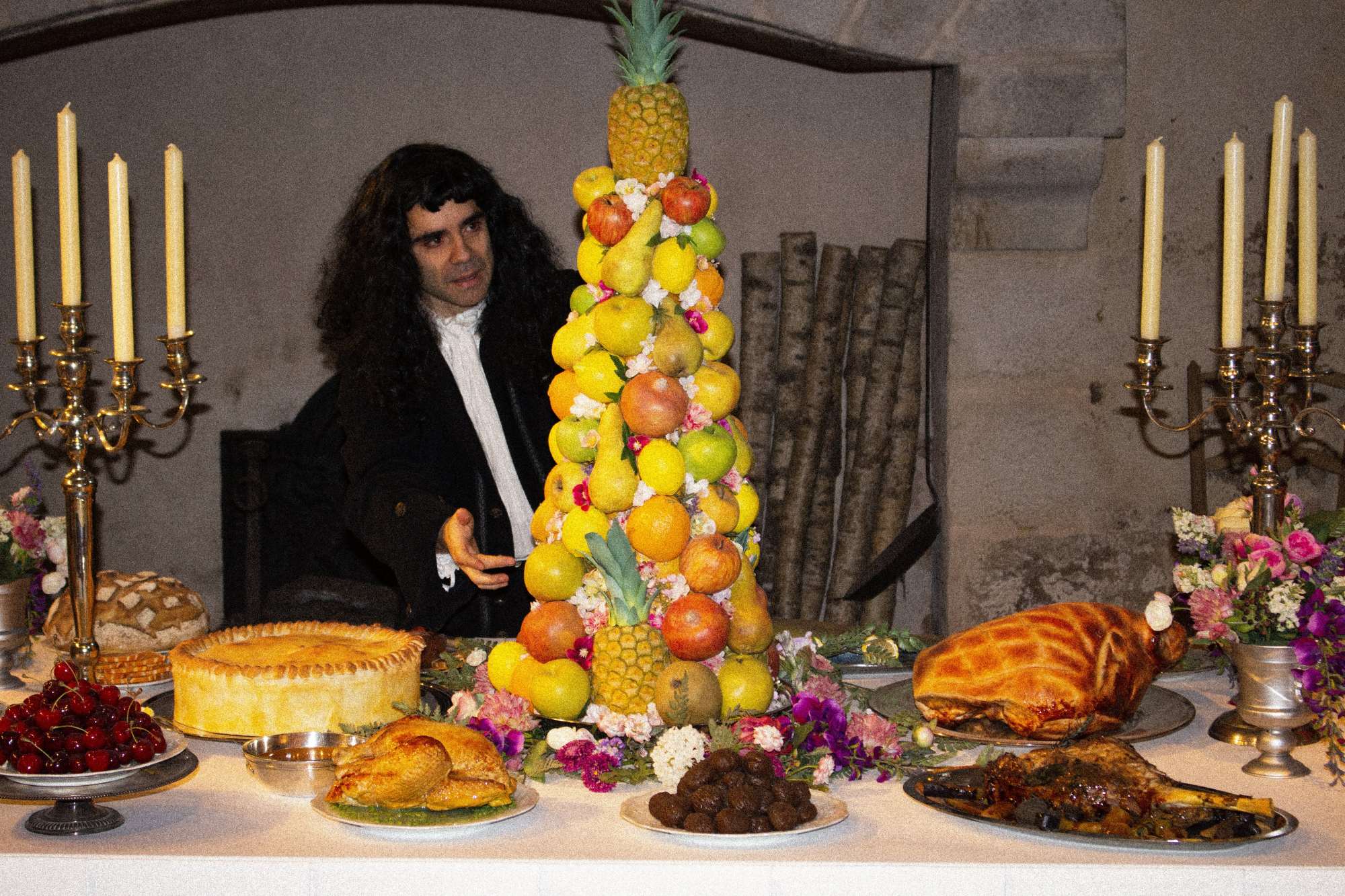 Château de Vaux-le-Vicomte – Tower of candied fruit, laid on a table with a white cloth, surrounded by flower vases with a meat pie in the background.Unfortunately, none the display was real.