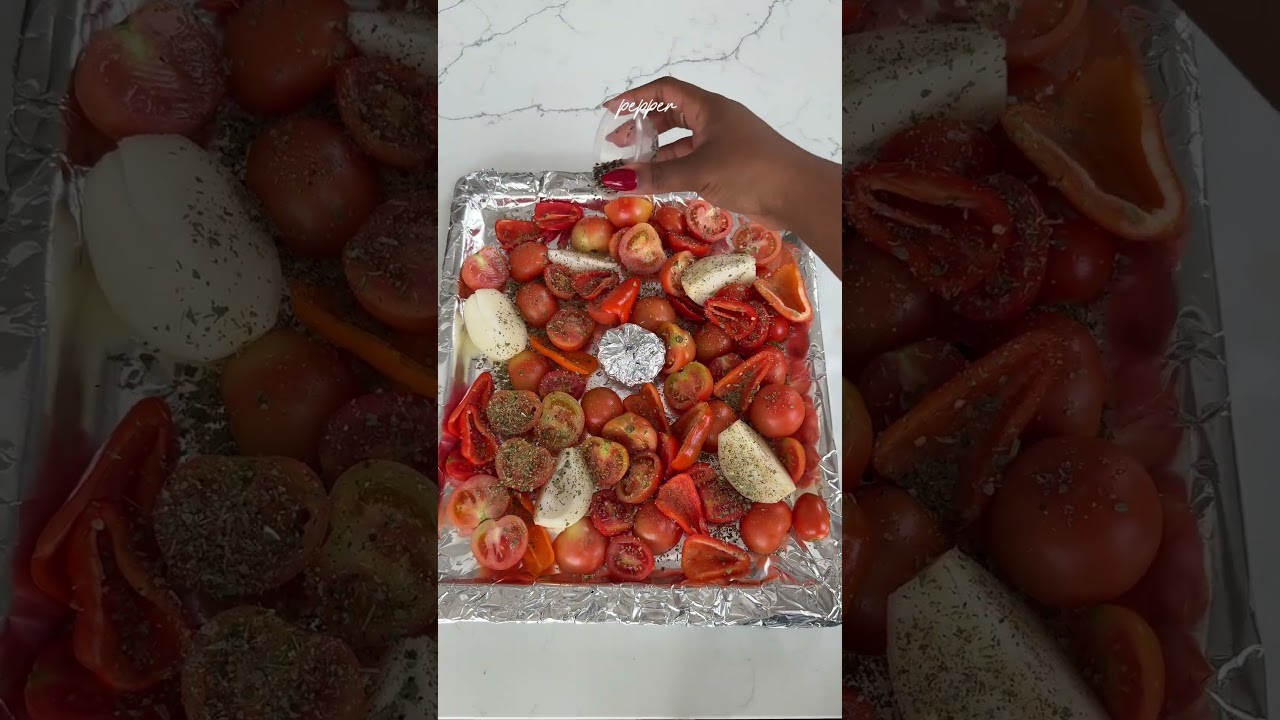2. Arrange the tomatoes, onion, and red pepper on a baking tray. Sprinkle with Italian seasoning, salt, and black pepper. Drizzle with oil if using, then toss to coat evenly. Place the wrapped garlic on the tray. *Chef’s tip: make sure to arrange the tomatoes, onion, and red pepper cut-side up on the baking tray. This helps to caramelise the vegetables evenly and enhances the flavour