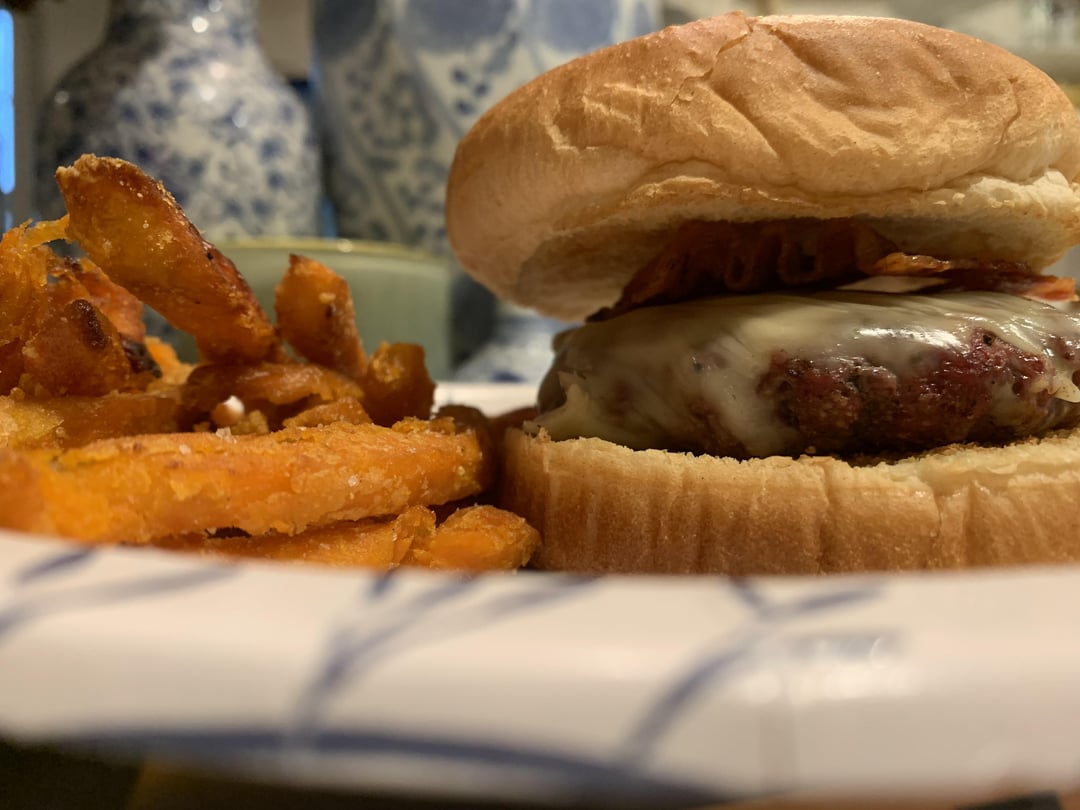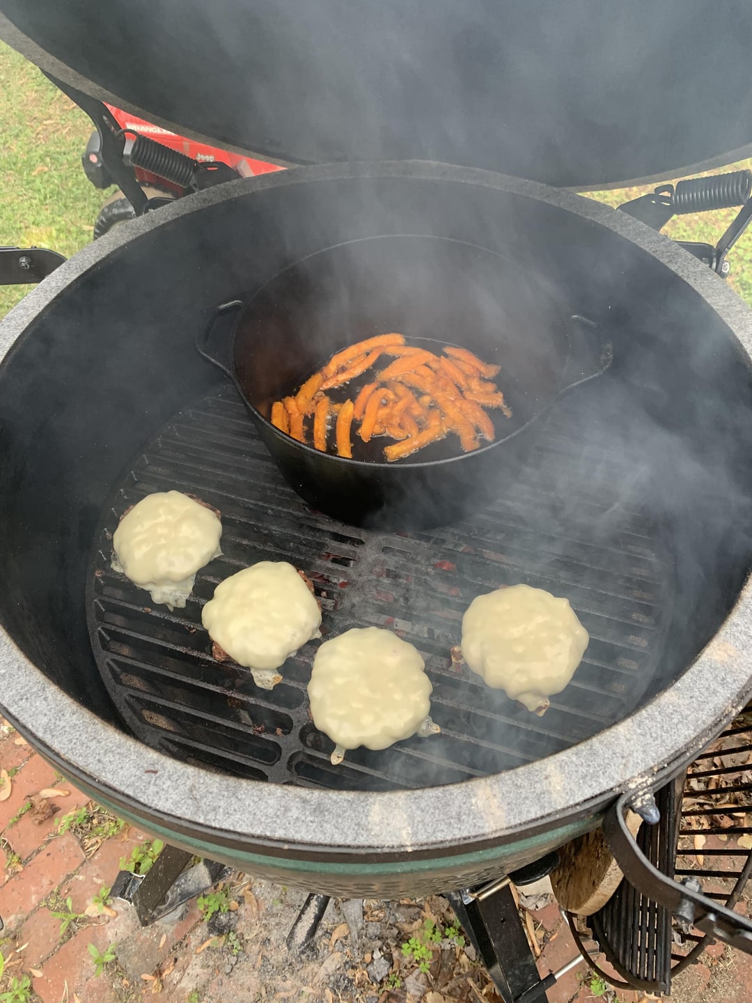 Frozen sweet potato fries in the lodge Dutch oven with some burgers on the cast iron grate.