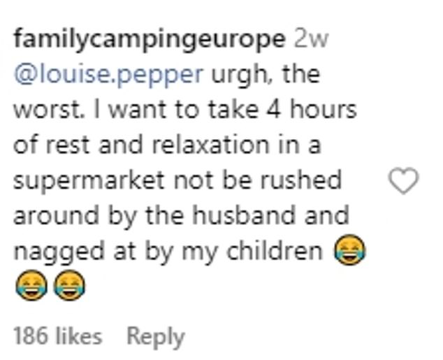 To which another follower, with the username @familycampingeurope, replied: ‘Urgh, the worst. I want to take 4 hours of rest and relaxation in a supermarket not be rushed around by the husband and nagged at by my children.’