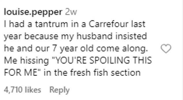 ‘I had a tantrum in a Carrefour last year because my husband insisted he and our 7 year old come along. Me hissing ‘YOU’RE SPOILING THIS FOR ME’ in the fresh fish section,’ wrote @louise.pepper.