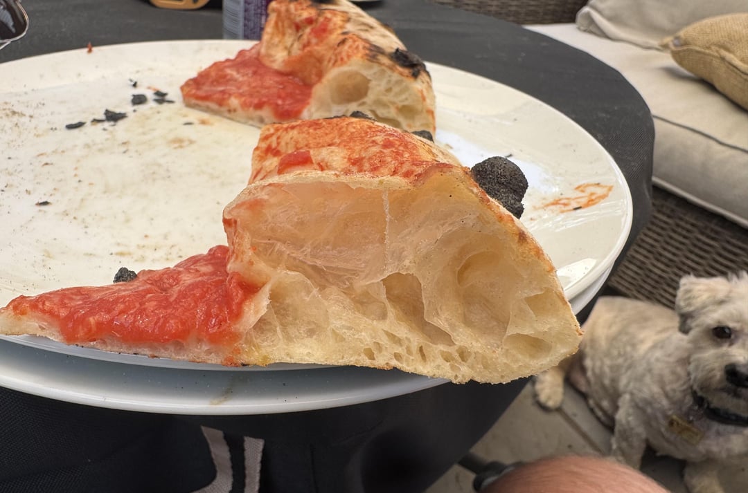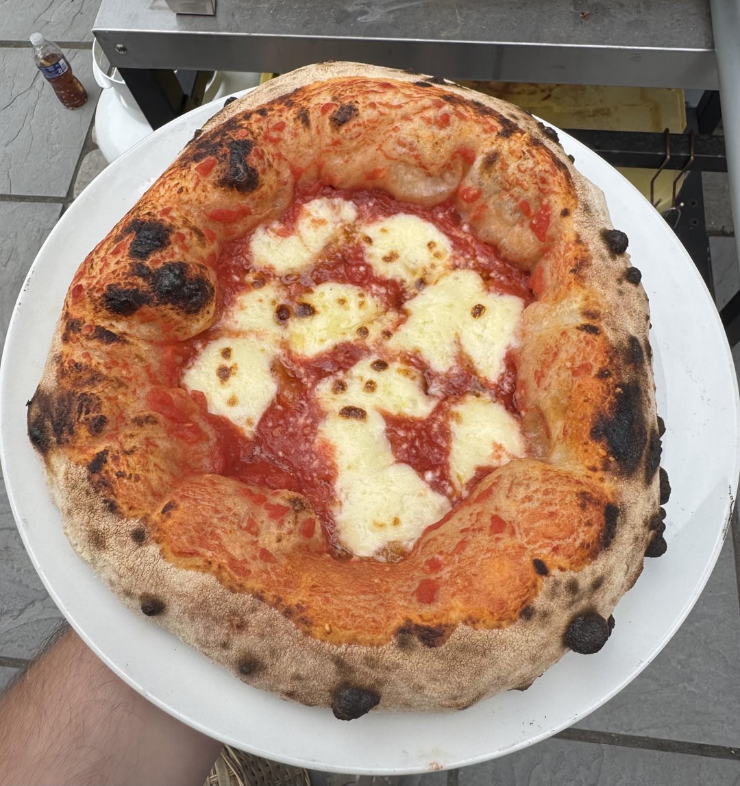 A little extreme on the size of the cornicione, but it looks amazing and not easy to get such good results (so empty and airy as it should be, not like many that don’t stretch it and end up with loads of dough in there)