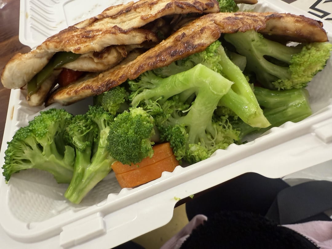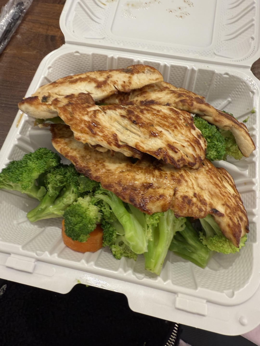 That is 8oz of chicken breast, 2 cups of broccoli, 1 carrot, and a tblsp of oil since the chicken looks pretty shiny…