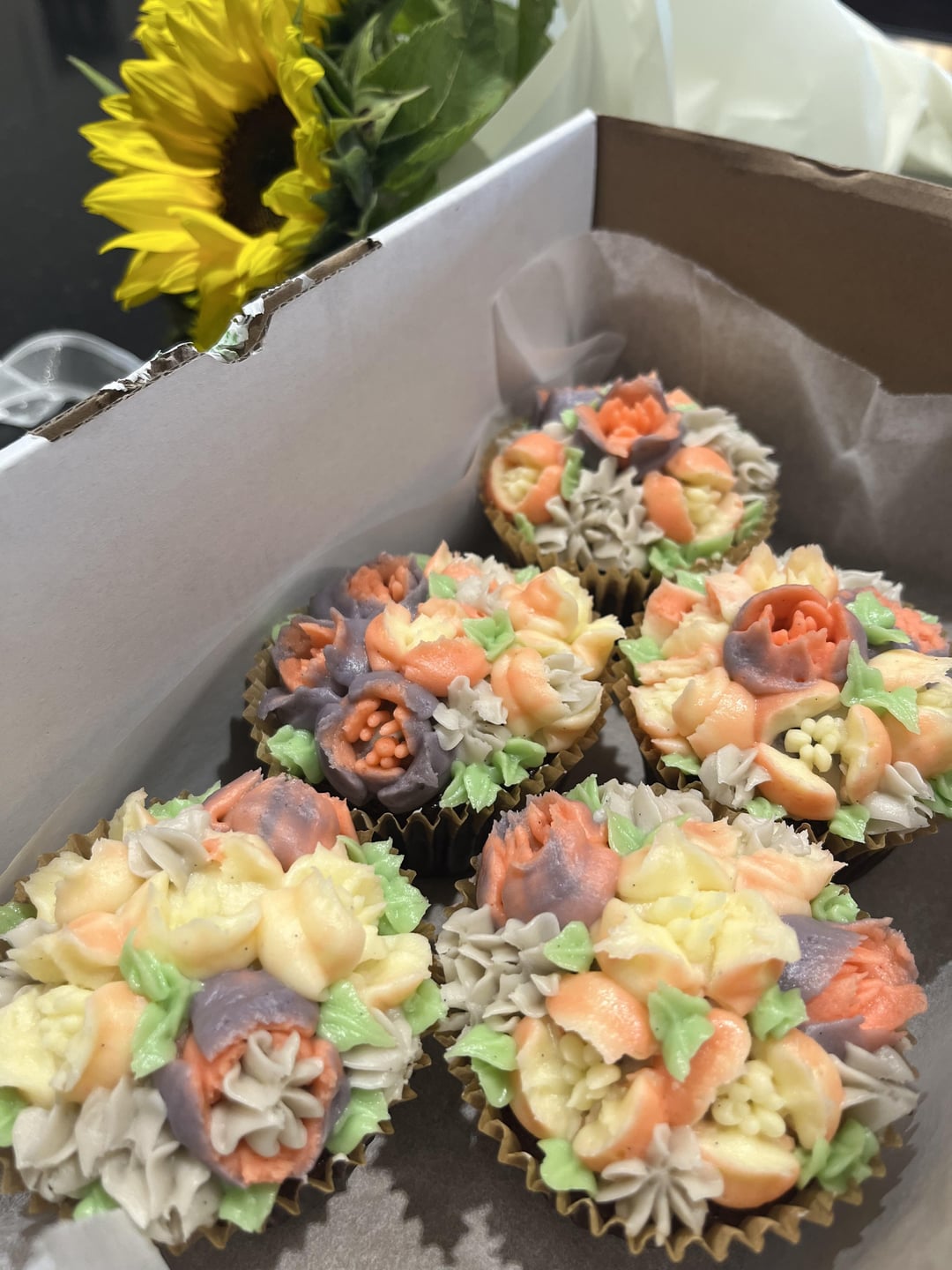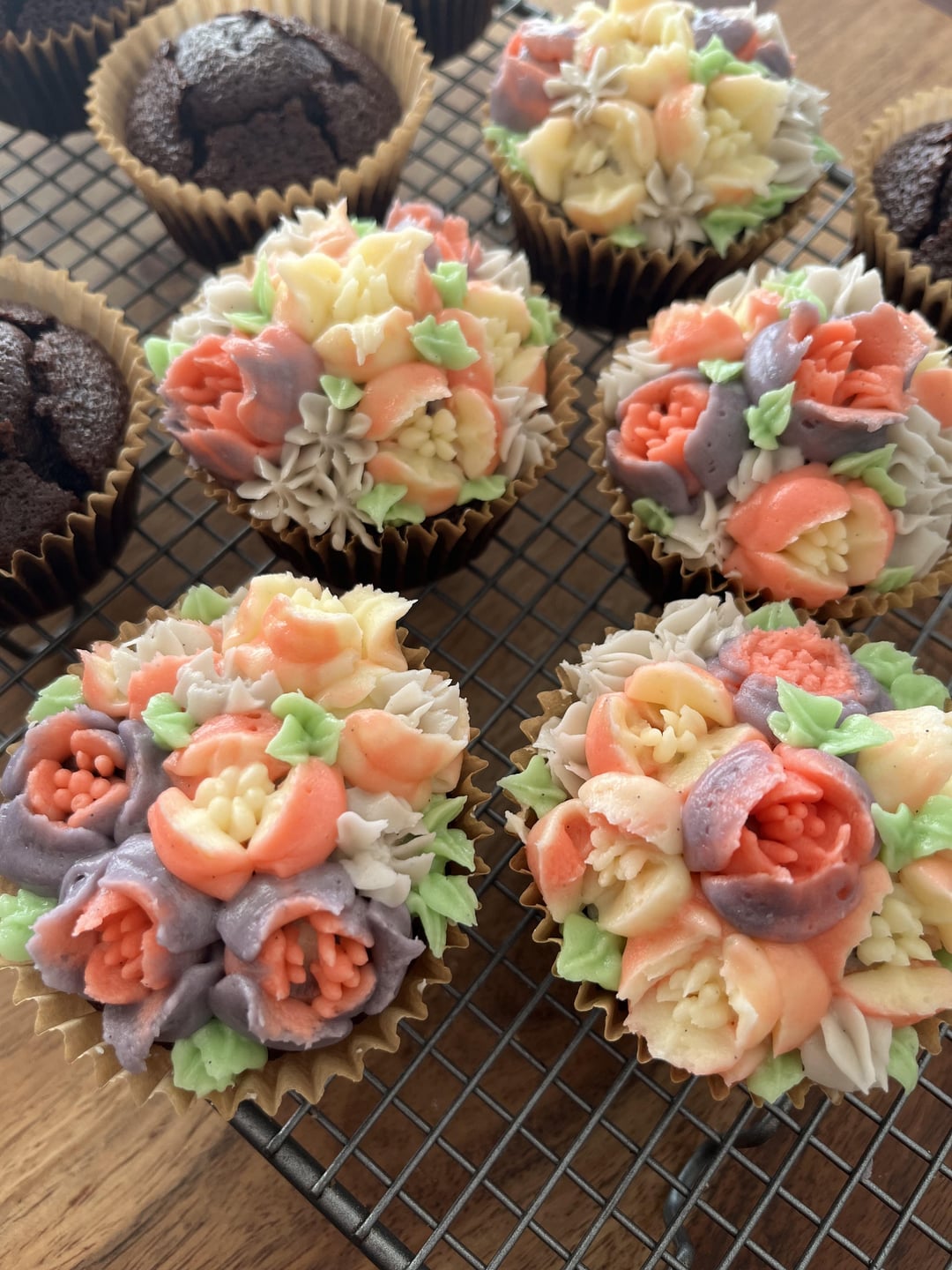 It was my first time piping a lot of flowers (I’ve done it once before but only one or two flowers), and my piping bag tip was too big for the nozzle so it broke halfway through haha, but I’m very happy with how they turned out and I’m so so happy that she loved them!