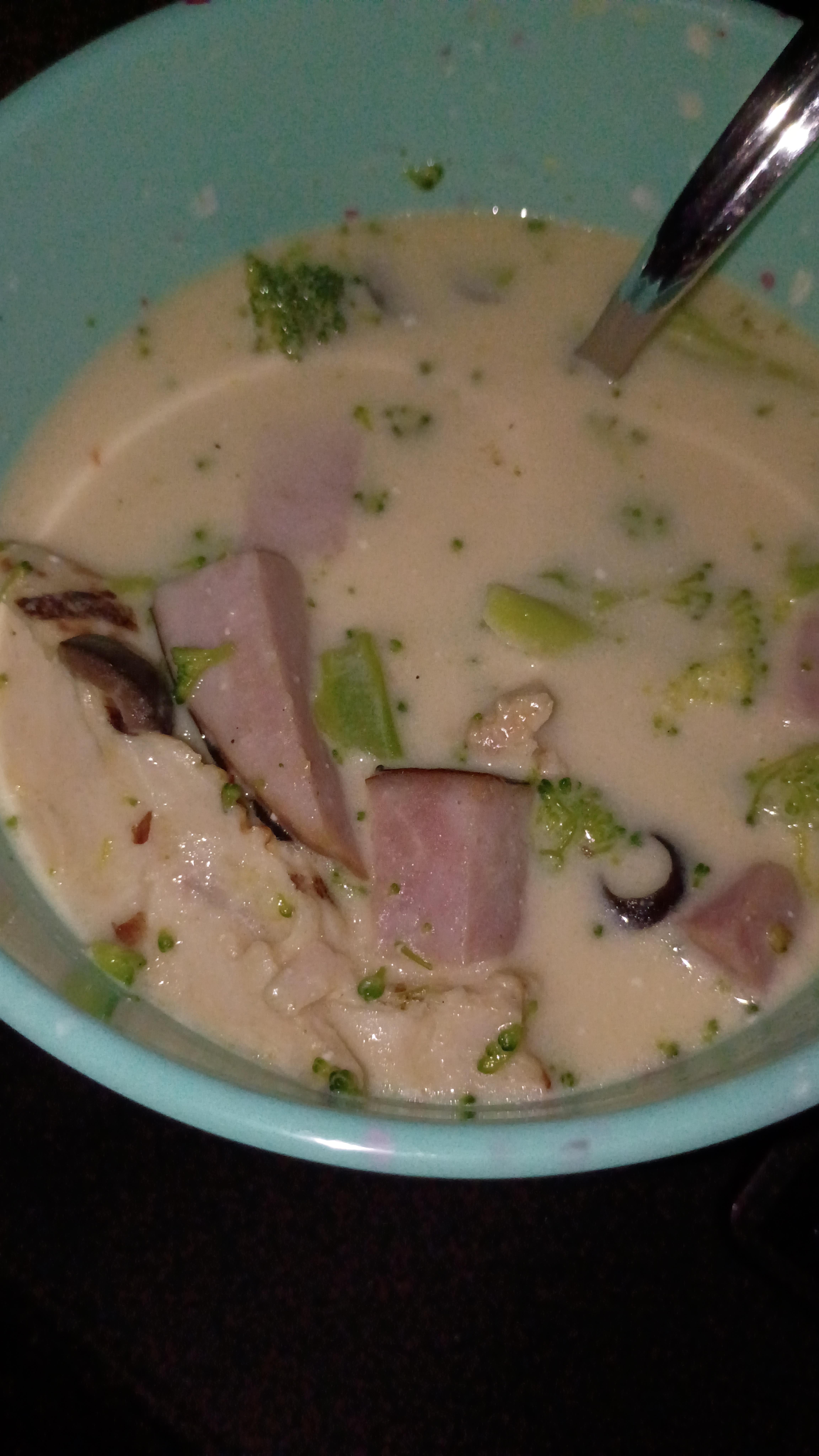 It's ham, black olives, chicken breasts, broccoli, the broth is chicken, with cheddar, mozzarella, and cream cheese. It's delicious and low carb by BigBakerJosh Write A CommentYou must be logged in to post a comment.