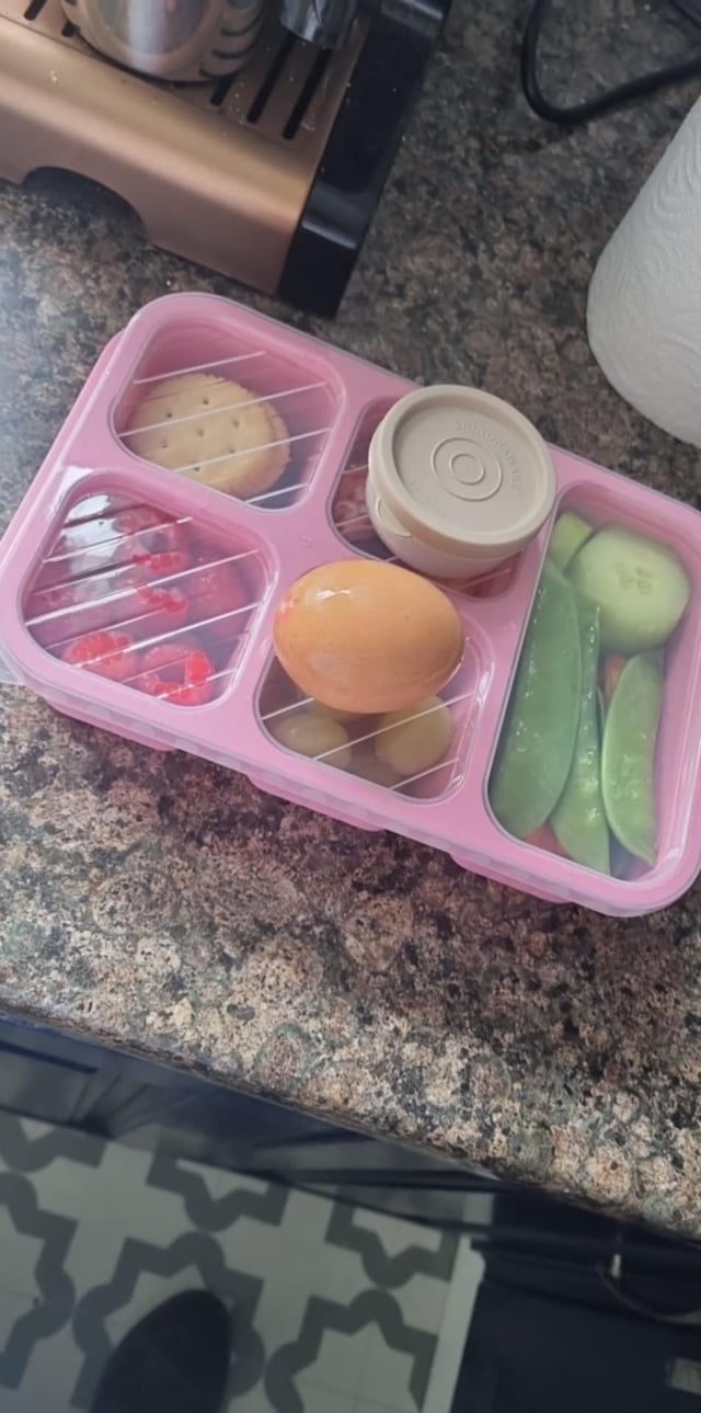 There's apricots under the raspberries and salted almonds under the crackers. Lil tub of hummus for the veg and a boiled egg that don't fit. Feeling very accomplished!