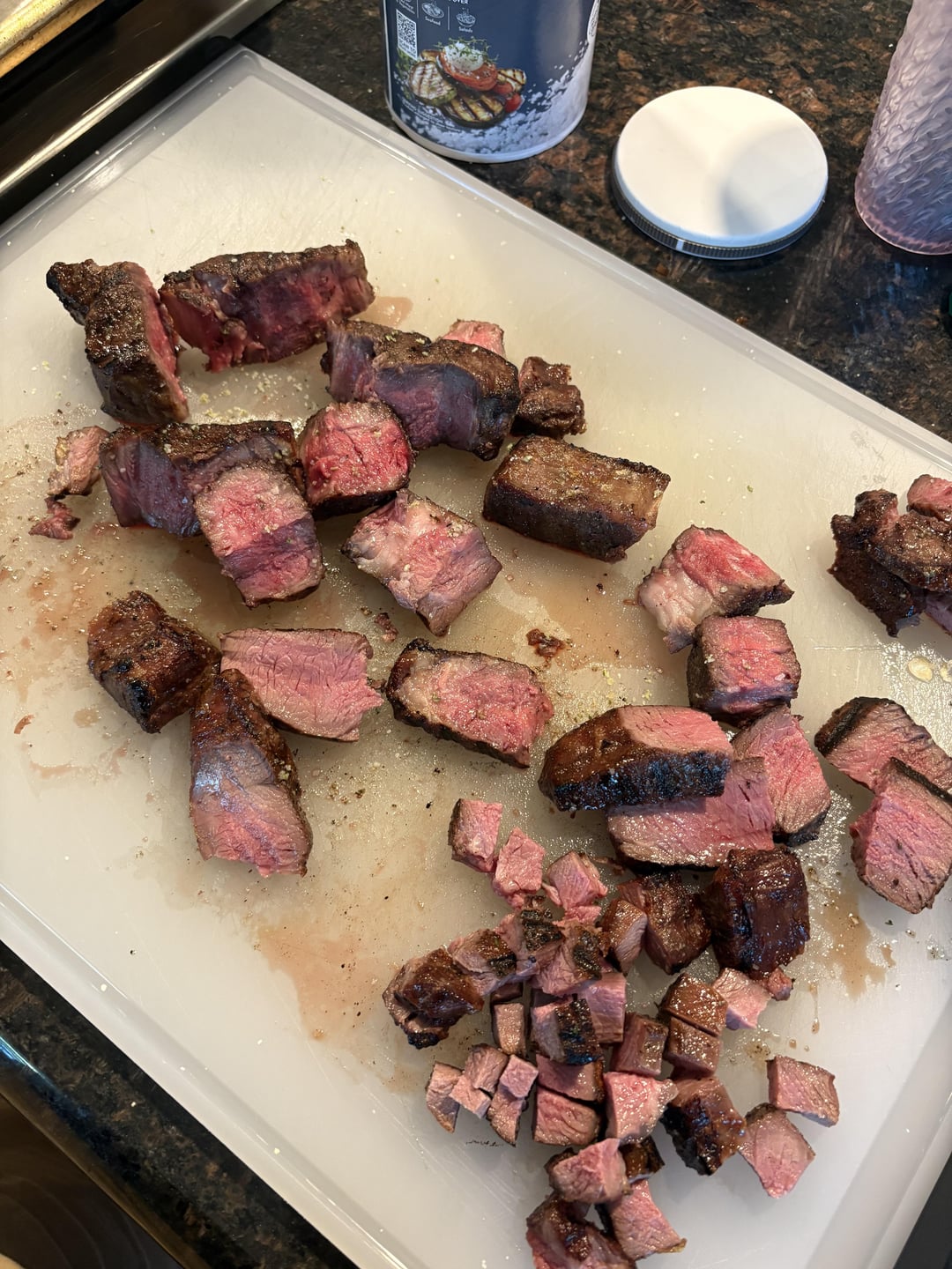 Made a salt with rosemary, sage, and lemon zest and seasoned them with that and fresh cracked pepper and then froze. Taken from the freezer and put in at 135 for 3 hours and then finished over hardwood charcoal. Super easy and the wife and 3 kids all liked it as well! I know the gray band is larger than most of you guys like, but I was more concerned with getting a good sear and Smokey flavor than keeping my edge to edge.
