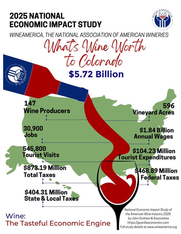 The 2025 National Economic Impact Study concluded that the production, distribution, sales, and consumption of wine in Colorado generates nearly $5.72 billion in total economic activity. These figures have increased from WineAmerica’s 2022 Economic Impact Study, where the total impact in Colorado was $3.91 billion. The wine industry’s impact on the U.S. economy is an estimated $323.55 billion, an increase from $276 billion in 2022. Many sectors of the United States economy benefit from the wine industry as it preserves agricultural land, provides American jobs, attracts tourists, generates taxes, and enhances the quality of life. Wine is produced in all 50 states and the District of Columbia.