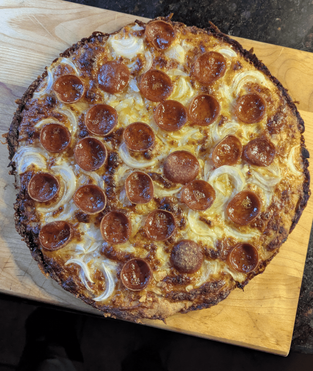 Sorry I didn’t realize I need to include the whole recipe. I mean it’s the box King Arthur keto pizza dough. Although the first time I made it I split the box and I used way too much “flour”. It’s supposed to be 1 and 1/3 cup but I only ended up with 3/4 of a cup. Anyway I managed to get it to stretch all the way across a 10-in iron skillet, 12 in I don’t know. Tomato paste, mozzarella, thinly sliced onion. And that pepperoni that curls up on the edges. Hit it with a little olive oil before it went in the oven. 475° in an iron skillet. I put the dough into the skillet and then just kept pressing it to the edges every 10 or 15 minutes. Until it covered the bottom. Put cheese out to the edge so it had that Detroit kind of a vibe. Anyway pretty tasty. I mean the dough is kind of like cardboard, but if you top it with enough stuff it’s pretty damn tasty. The hard part was that my wife made a pizza on the grill for her and the kids, and she absolutely crushed it. Had a couple of bites, but, stuck with my keto pie. Down 13 lb a few weeks. Pretty psyched.