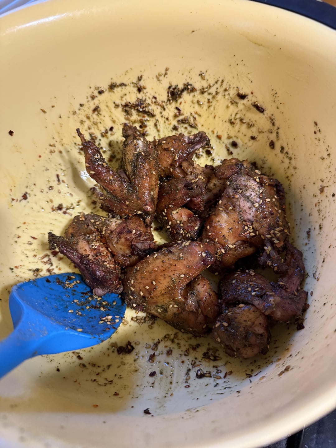 Post spin, I tossed the wings in about 1.5 tbsp of zatar and 2 tsp of Aleppo pepper.