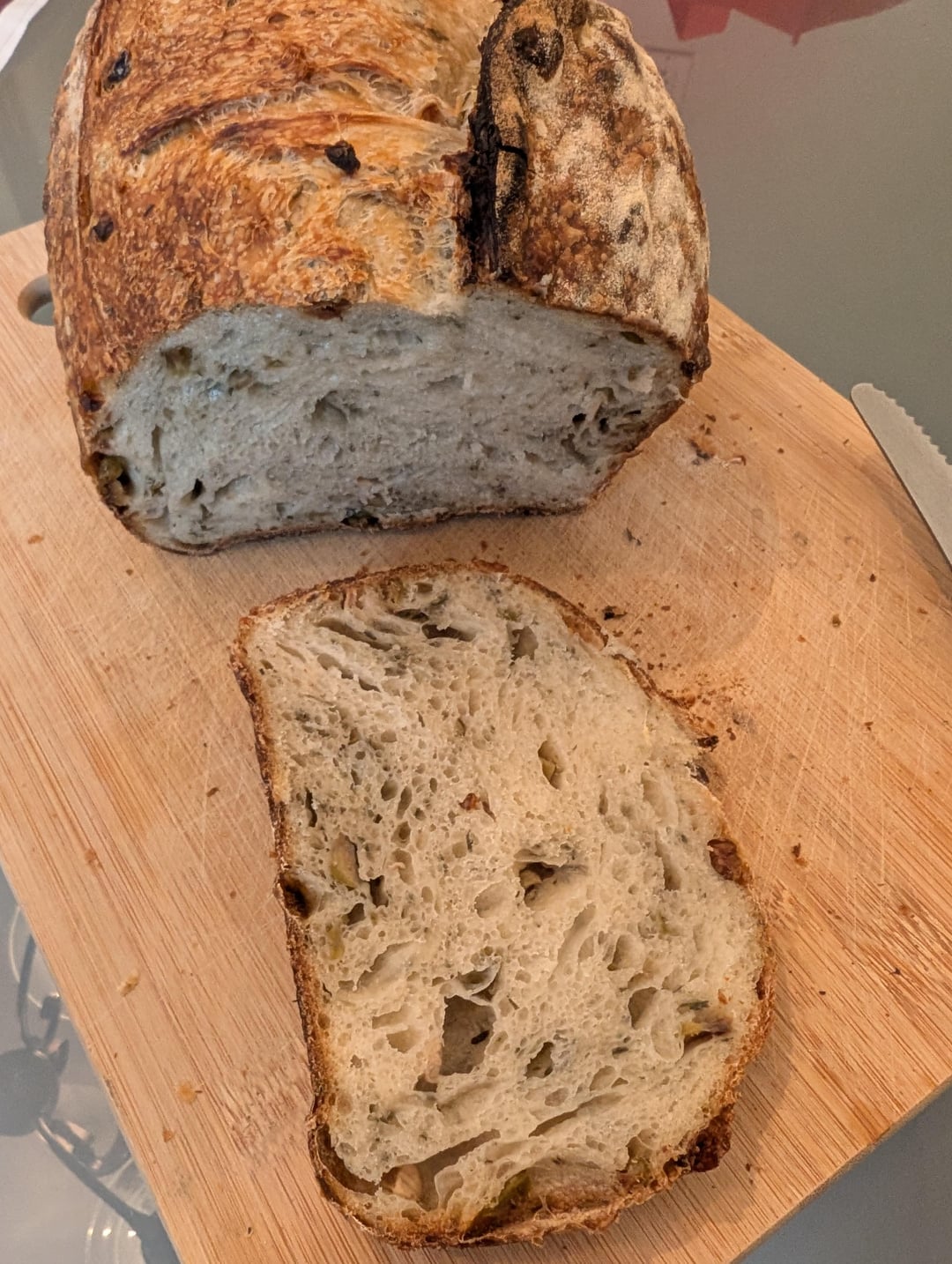 Great loaf! My go to is kalamata olives and rosemary, Iβll have to try green olives.