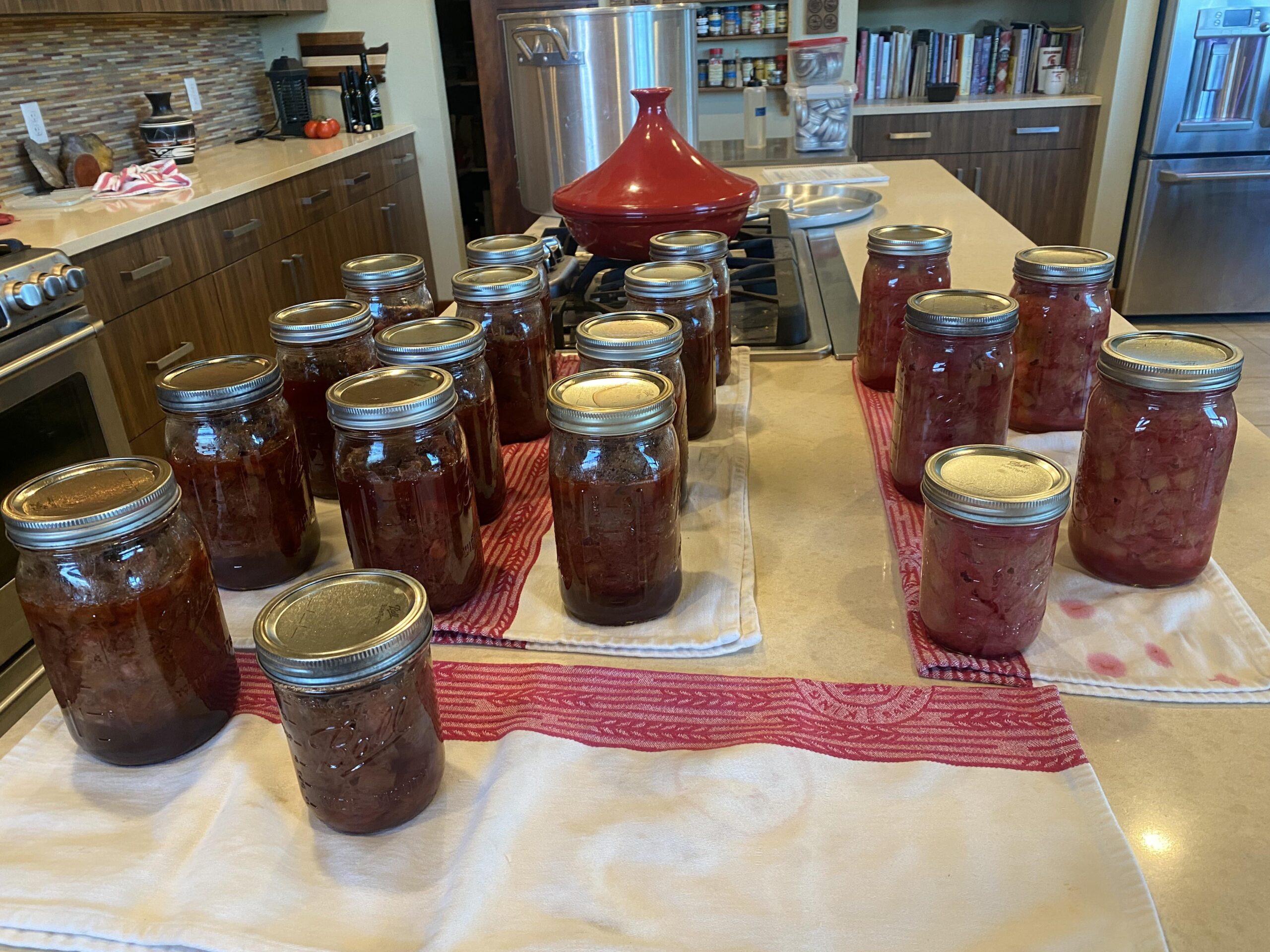 I canned 21 pounds of rhubarb using the standard NCHFP instructions, using sugar, and pressure canned this batch. Expected yield 14 quarts, actual yield 12 quarts 1 pint (shown on left).