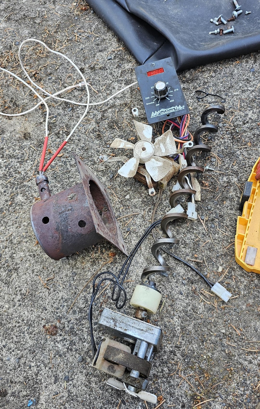 I yanked out the thermostat, wiring, both fans, fire pot, augur, and hot rod. Auger is still straight (not bent) and rolls nice. New components are shipping overnight.