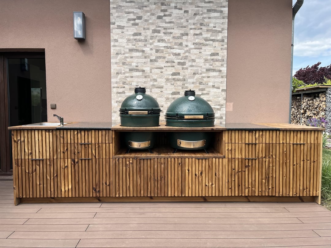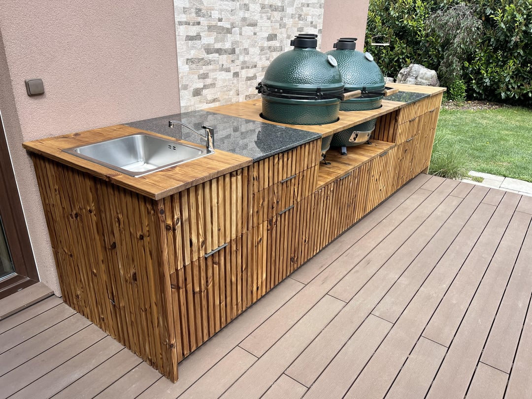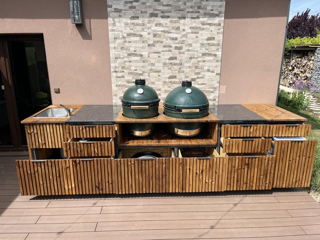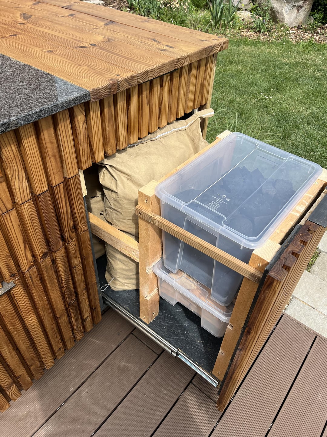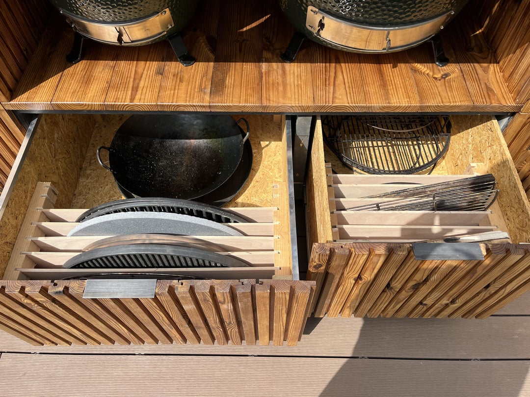 Structure is from construction lumber, paneling and tabletops are thermo pine finished with UV protective oil. I decided to have slide out drawers everywhere. Which turned out to be the hardest part, mainly due to the structure being made of rough cut lumber. Storage of the components for each grill is under the other on, so I can access it easily and also to have a better support for the XL.