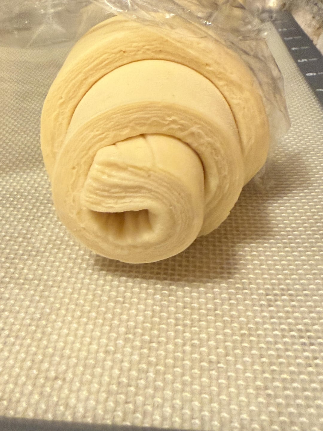 I do a French lock-in, then a book fold, then a letter fold resulting in 25 layers. When hand laminating, it’s important to not press down very much and instead push away from you, elongating the dough instead of squishing it down.