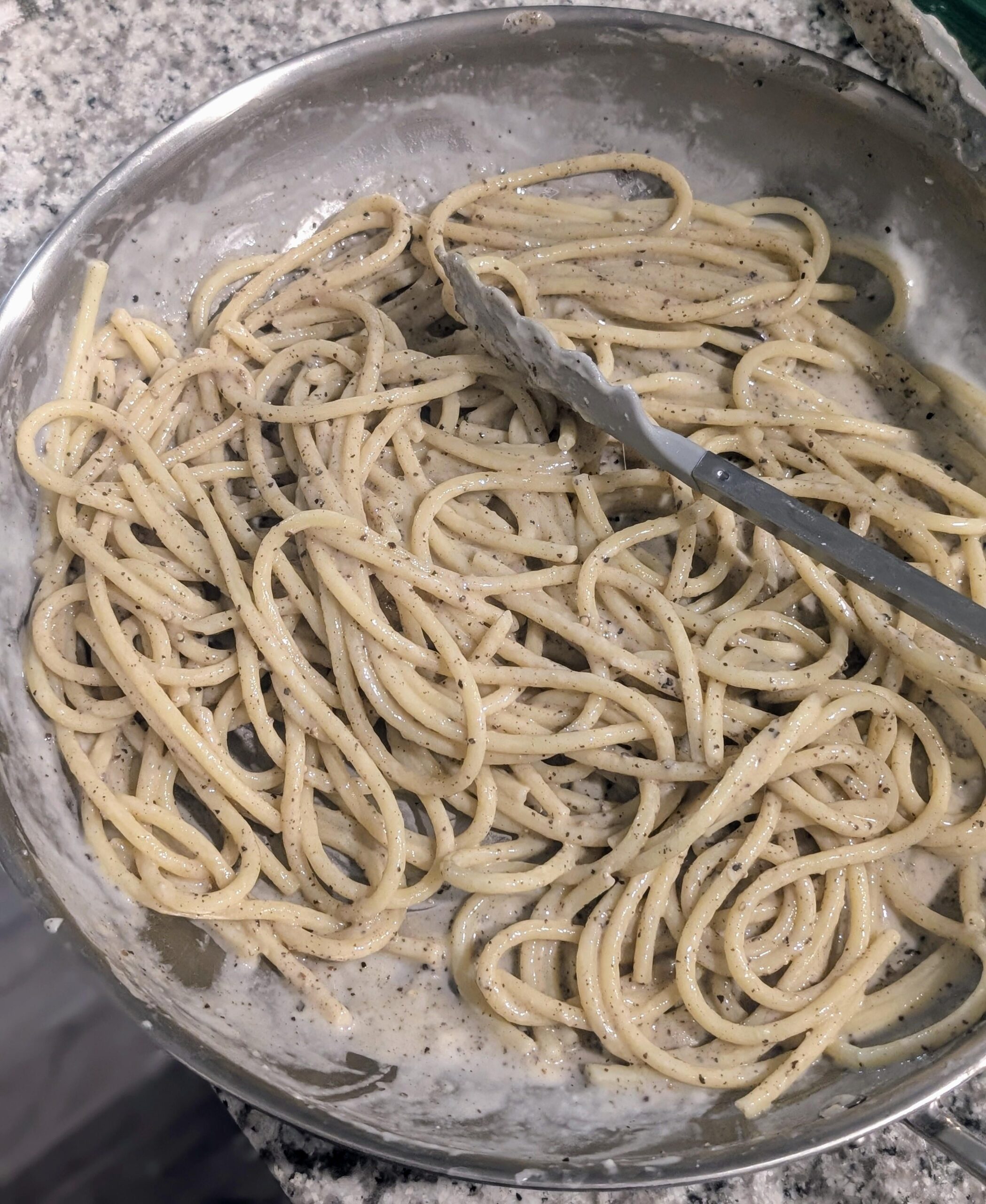 3. Tong pasta directly into pepper pan (a bit of water clings). Add ~½ cup hot pasta water. Let sit 30 sec.