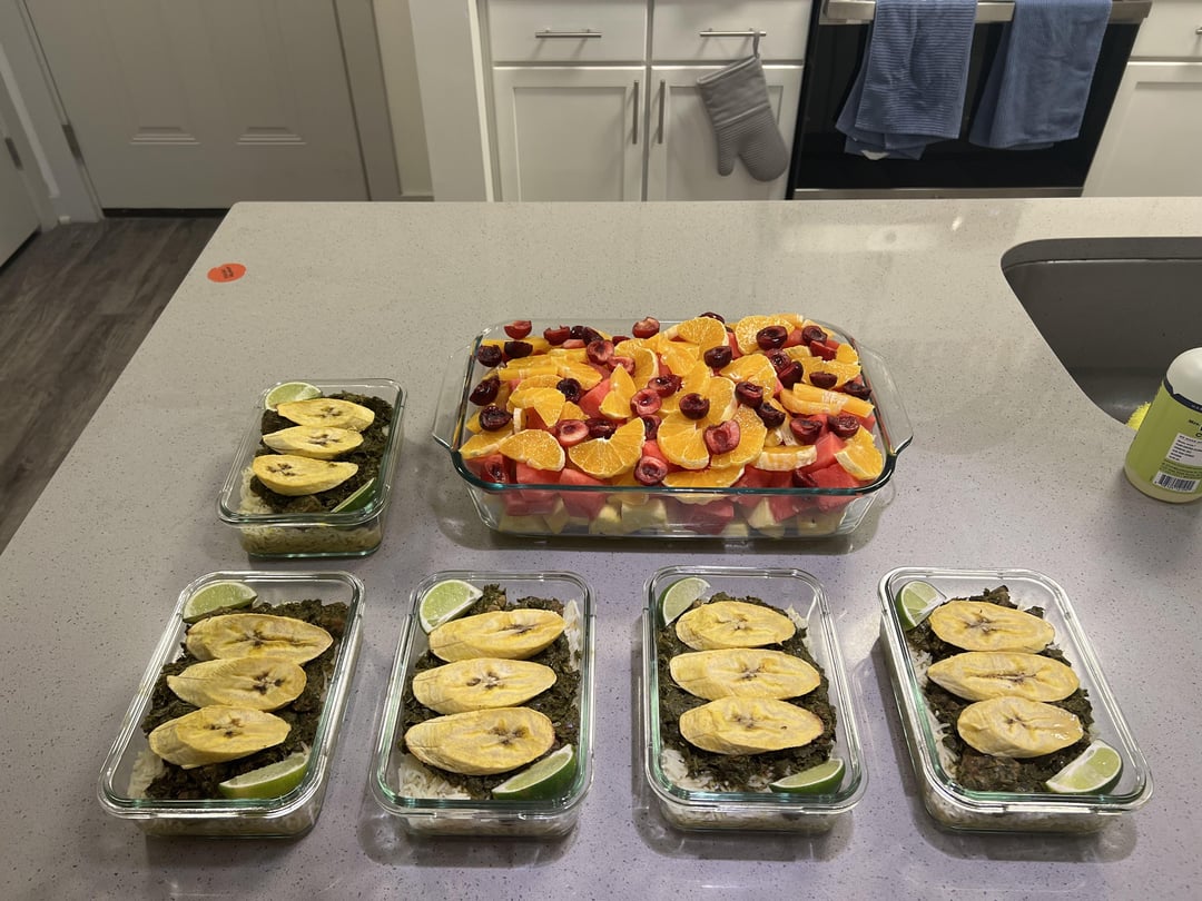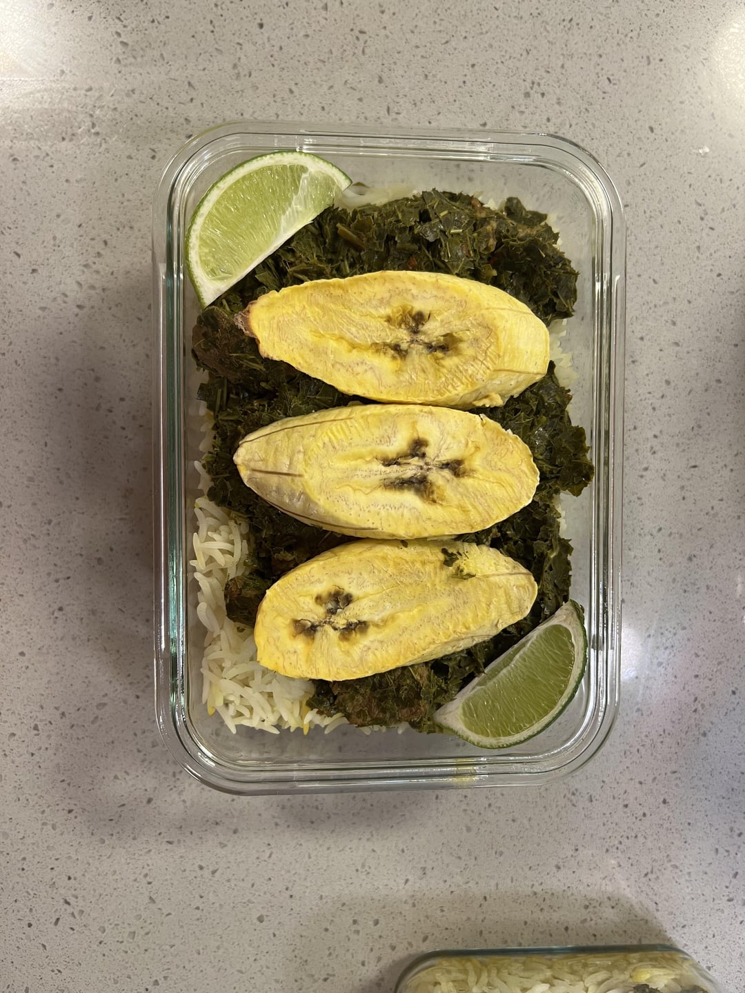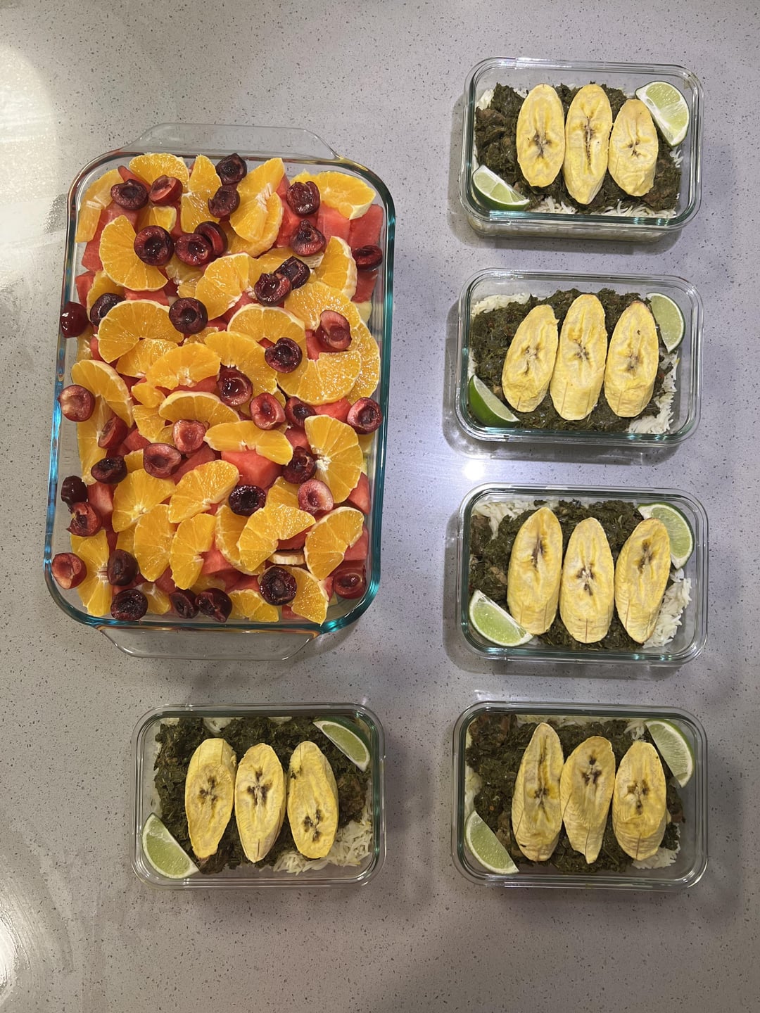 This is a popular dish from Madagascar. It’s made of crushed cassava leaves, coconut milk, and pork belly. I added plantain just for fun. Also included is my weekly fruits.