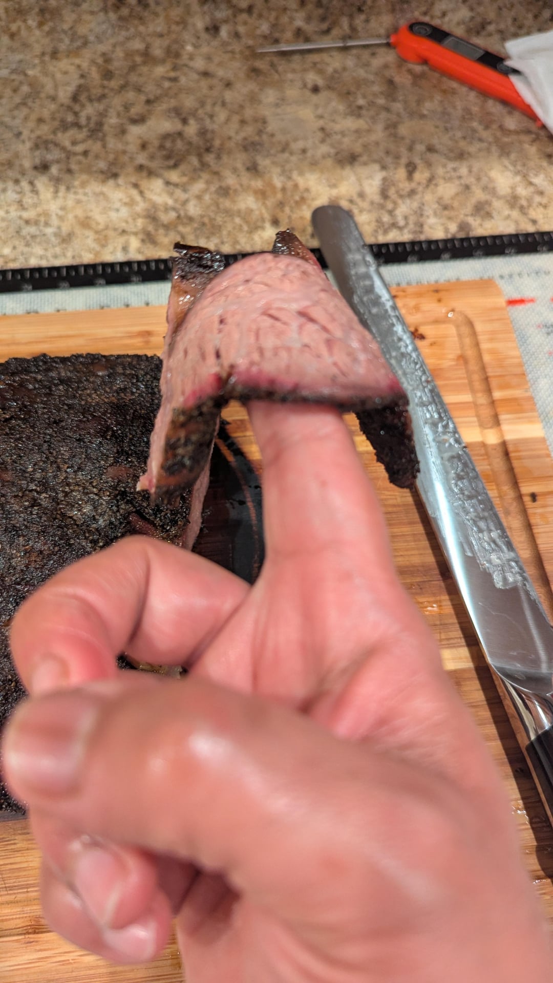 Finally the time to taste, the bones came out eat.. Sliced it against the grain. Really juicy. I think it passed the finger bend test and pulls apart real easy.