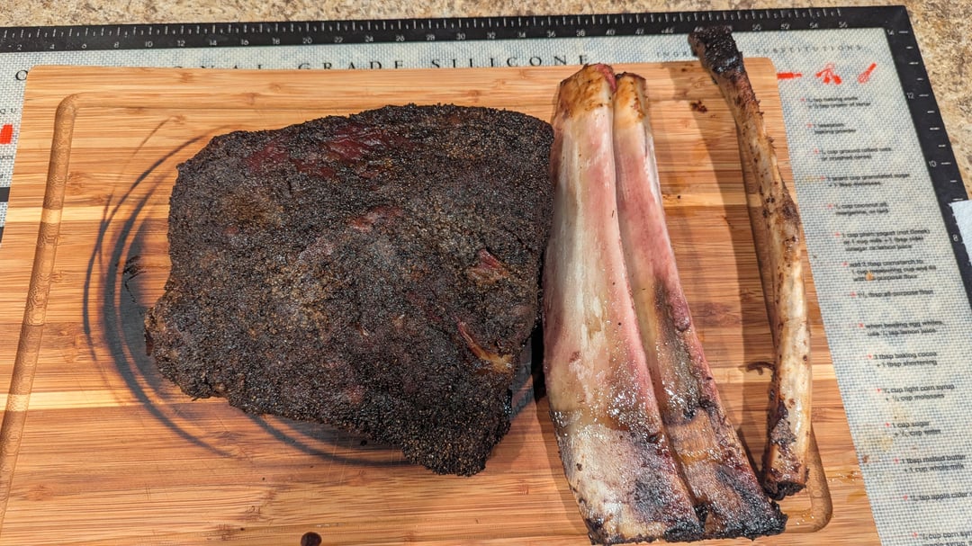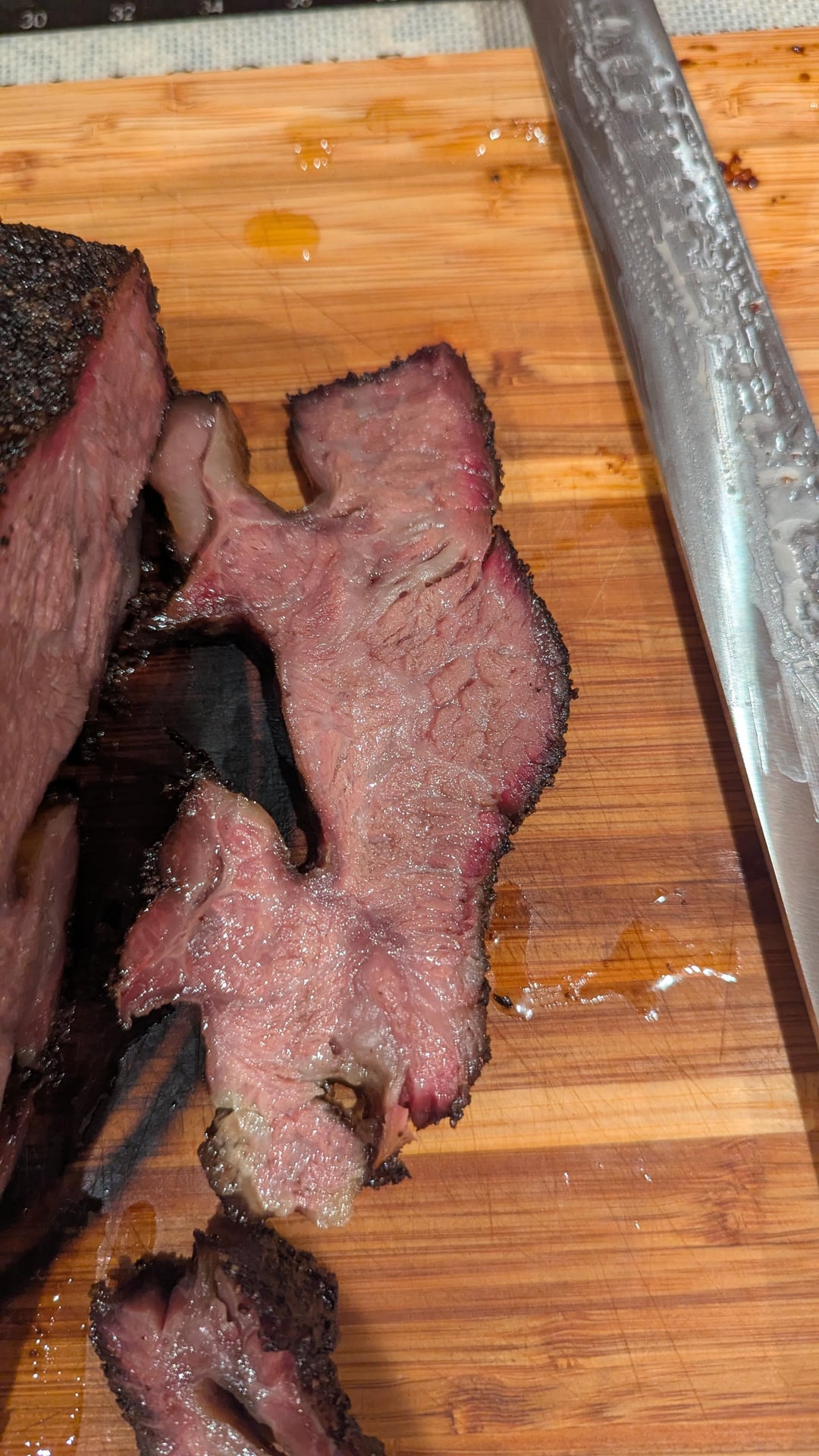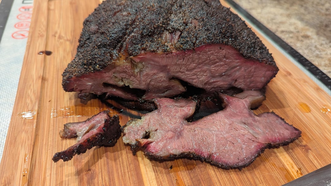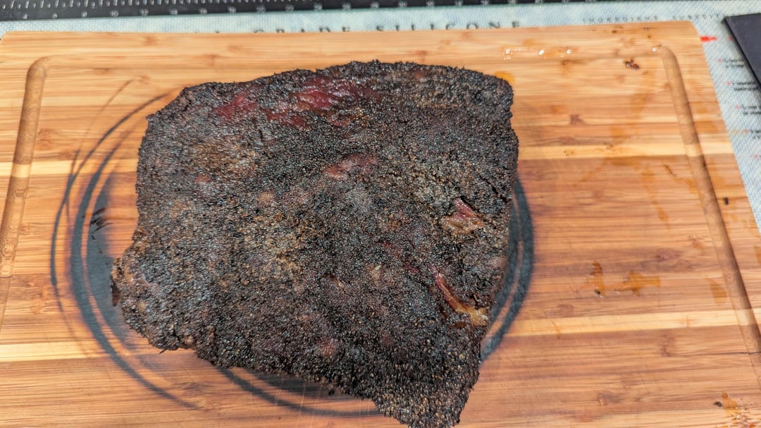 Not a super prominent smoke ring and the bark isn't as dark as I have seen and I could use a bit more salt but all in all, it was very good.