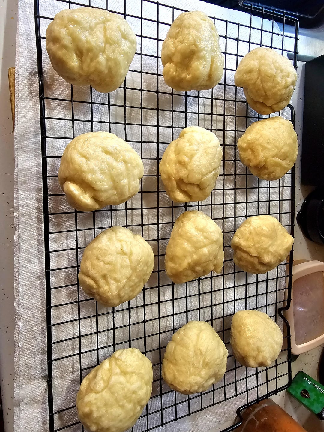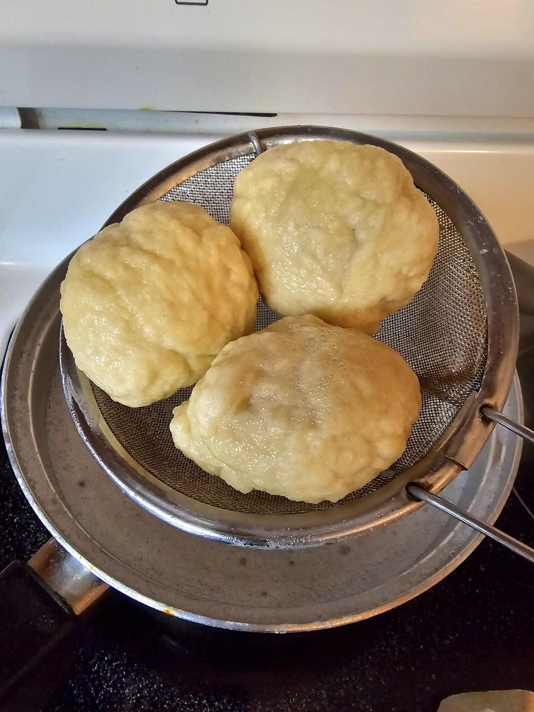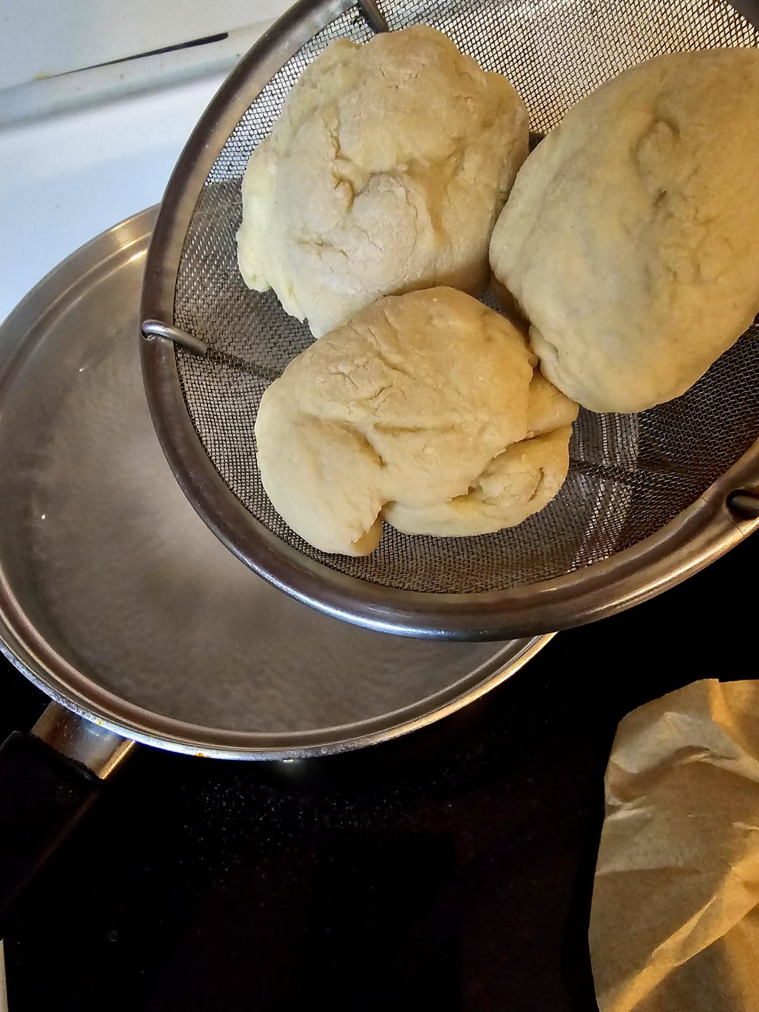 Once the dough is ready, separate it into balls about the size you like to put in your mouth. Bring 12:1 water:baking soda to a boil and drop the balls for 45-60 seconds then drain your balls by racking them to let excess moisture drip off.