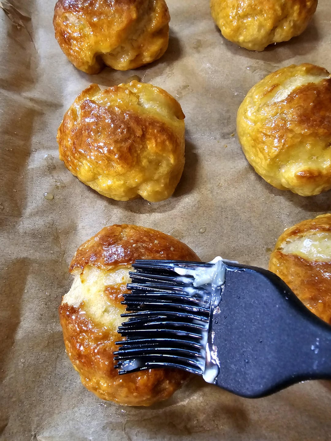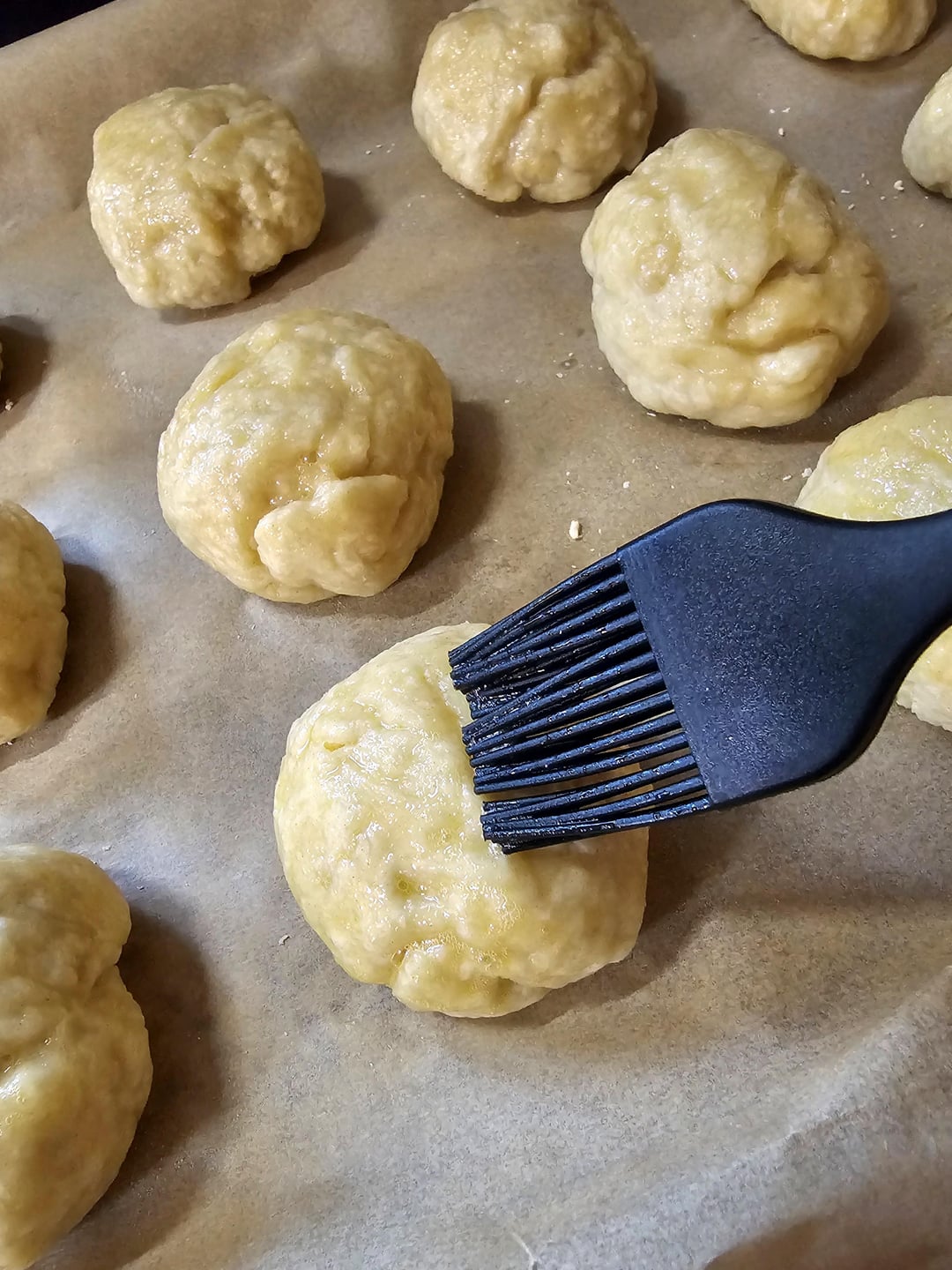 While your balls are still warm, rub them with butter, and bake at 420° until they brown. Remove, brush with butter again, and sprinkle with salt.