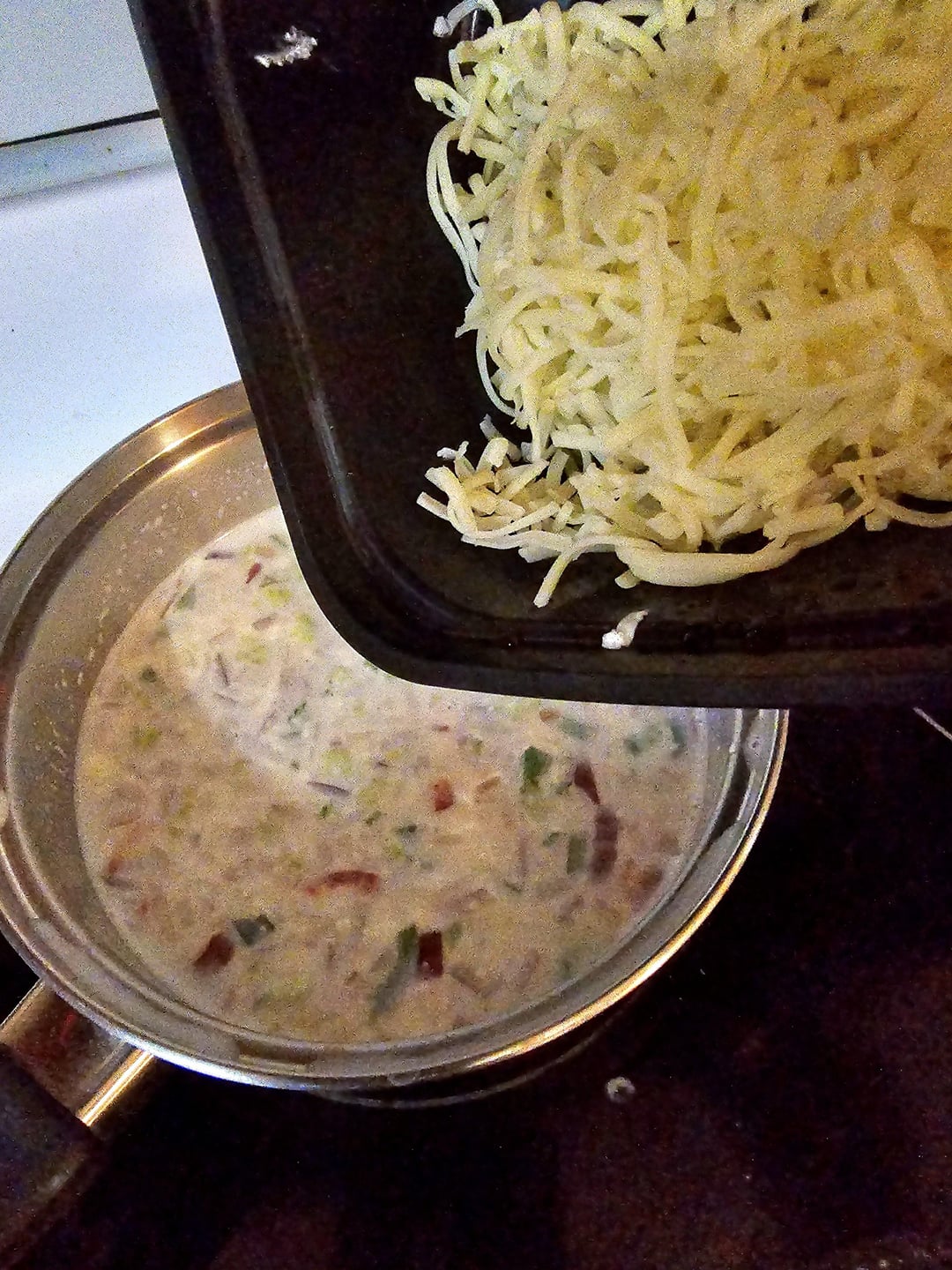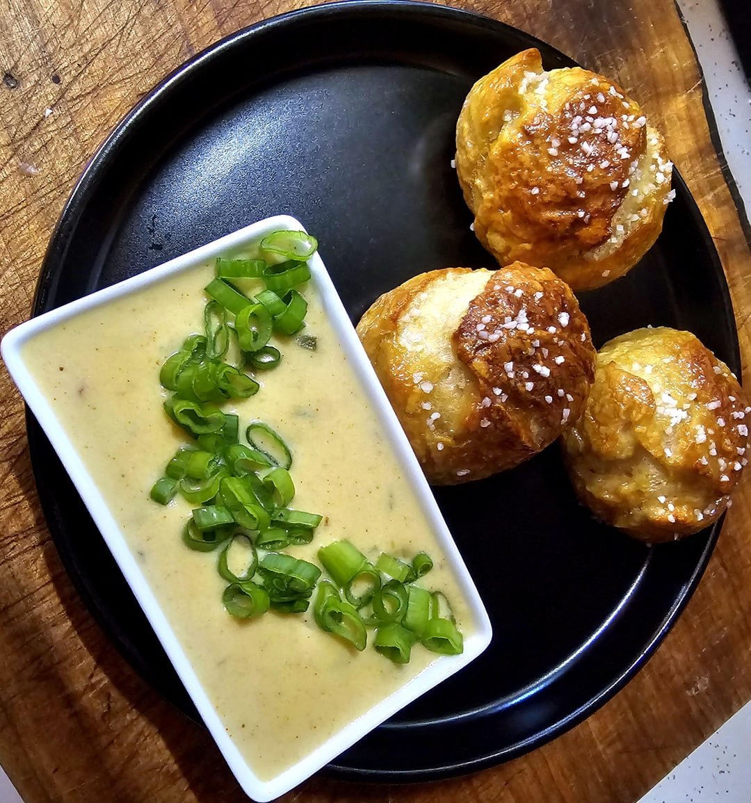 The queso I made while my balls baked. Heat some milk with red onion, garlic, red chilis, and jalapeños. When it starts to simmer add softened cream cheese….cold is fine too it just takes longer 😂…stir until it's smoothed then add shredded oaxaca (you'll probably have to buy a ball and shred it yourself), when it's all melted together season to taste with salt & pepper, cumin, paprika, chili powder, and oregano then enjoy with a smile of scallions 😁