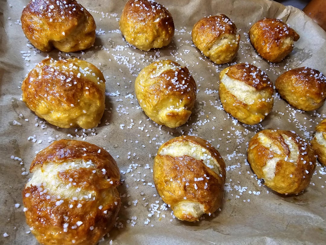 1. I had a French girlfriend once. She made something a similar to these pretzel rolls but she called them petits seins. They were just a bit bigger than a mouthful but I could not have enough of them, they were beautiful to look at and very delicious.