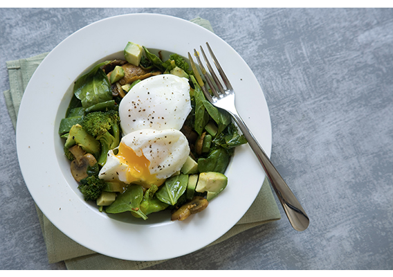 3. Place the greens into a large bowl, add the mashed avocado and top with the poached eggs. Season with salt and pepper.