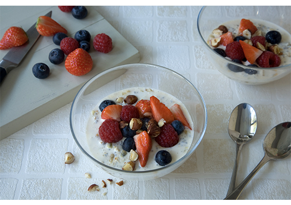 3. Plate up one portion and stir the seeds from 1 passion fruit through the oat mixture. Top with half the berries and hazelnuts.
