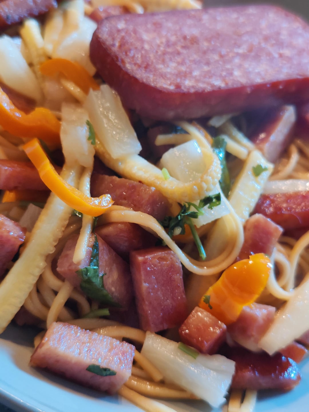 Fried spam, pineapple, and egg noodles with orange peppers, baby corn, chilli flakes, coriander, and soy sauce.by tobotic Write A CommentYou must be logged in to post a comment.
